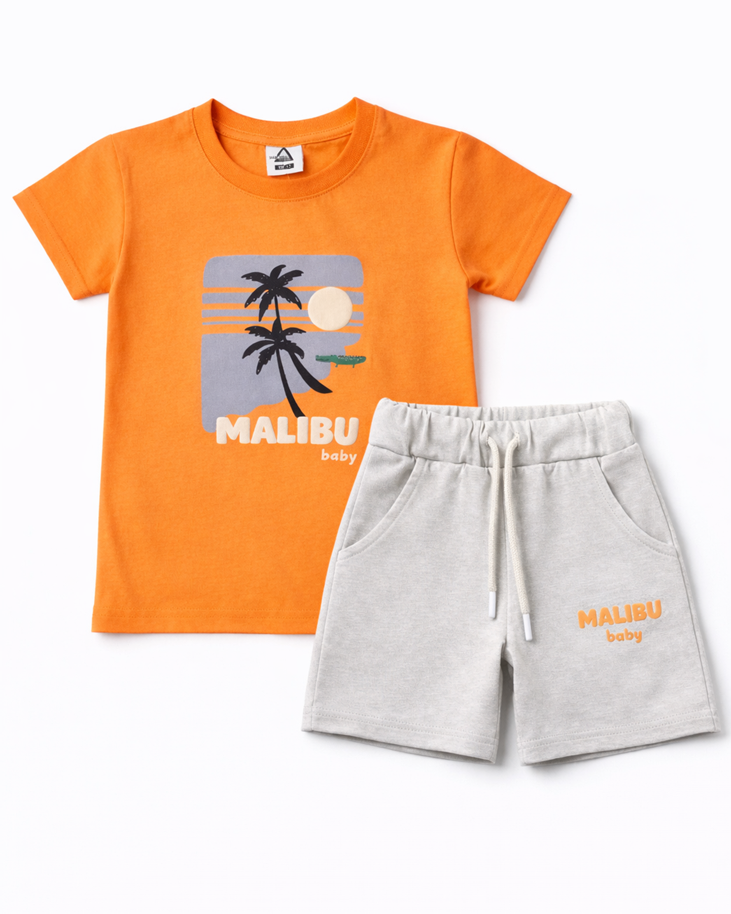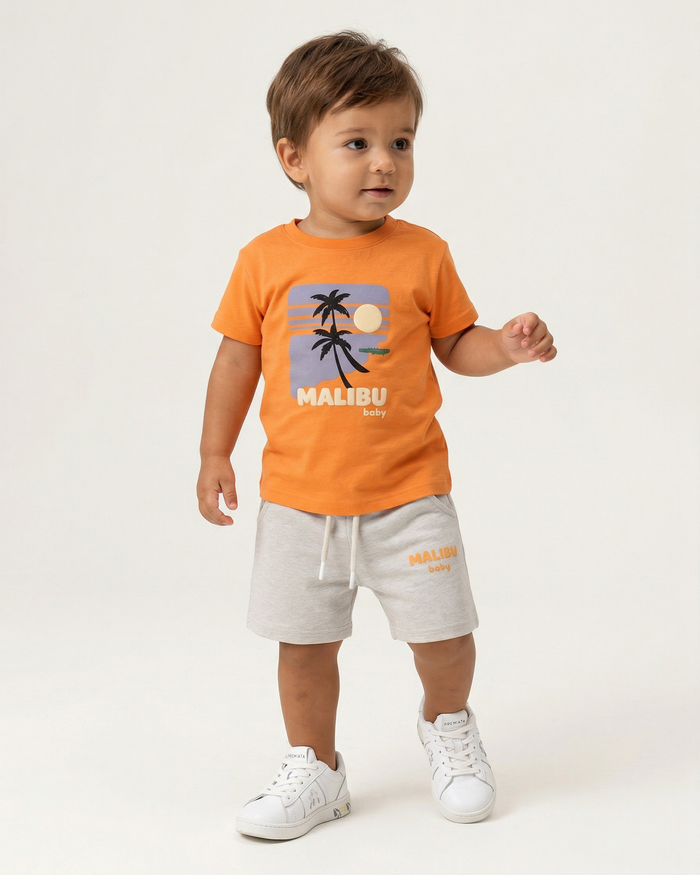 Erkek Bebek Baskılı Turuncu Renkli Şortlu İkili Takım