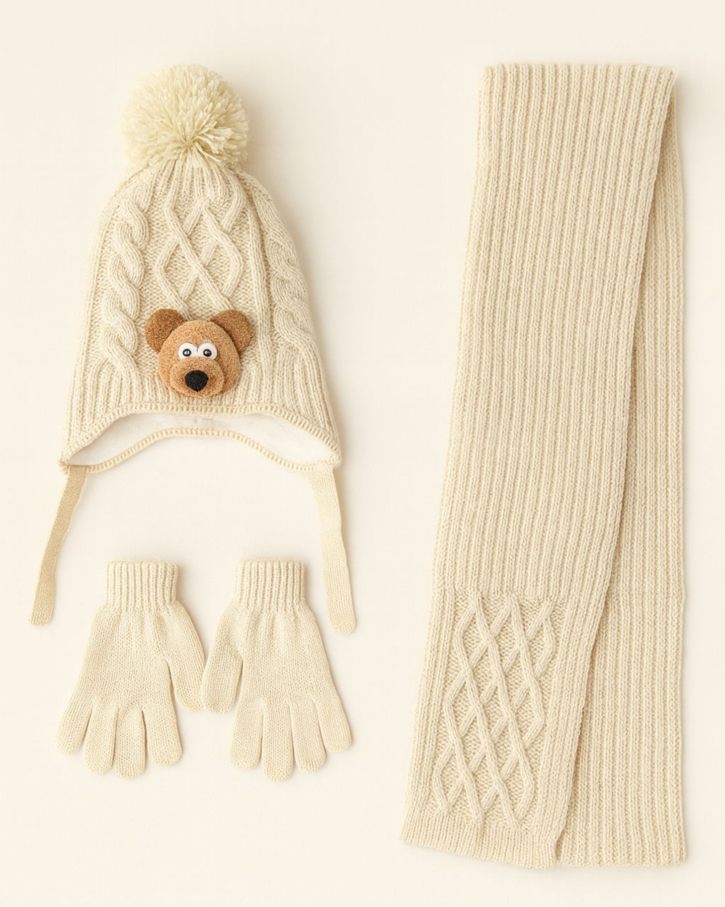 Erkek Çocuk 3’lü Şapka Bere Eldiven Seti – Figürlü Bej – 1-4 Yaş