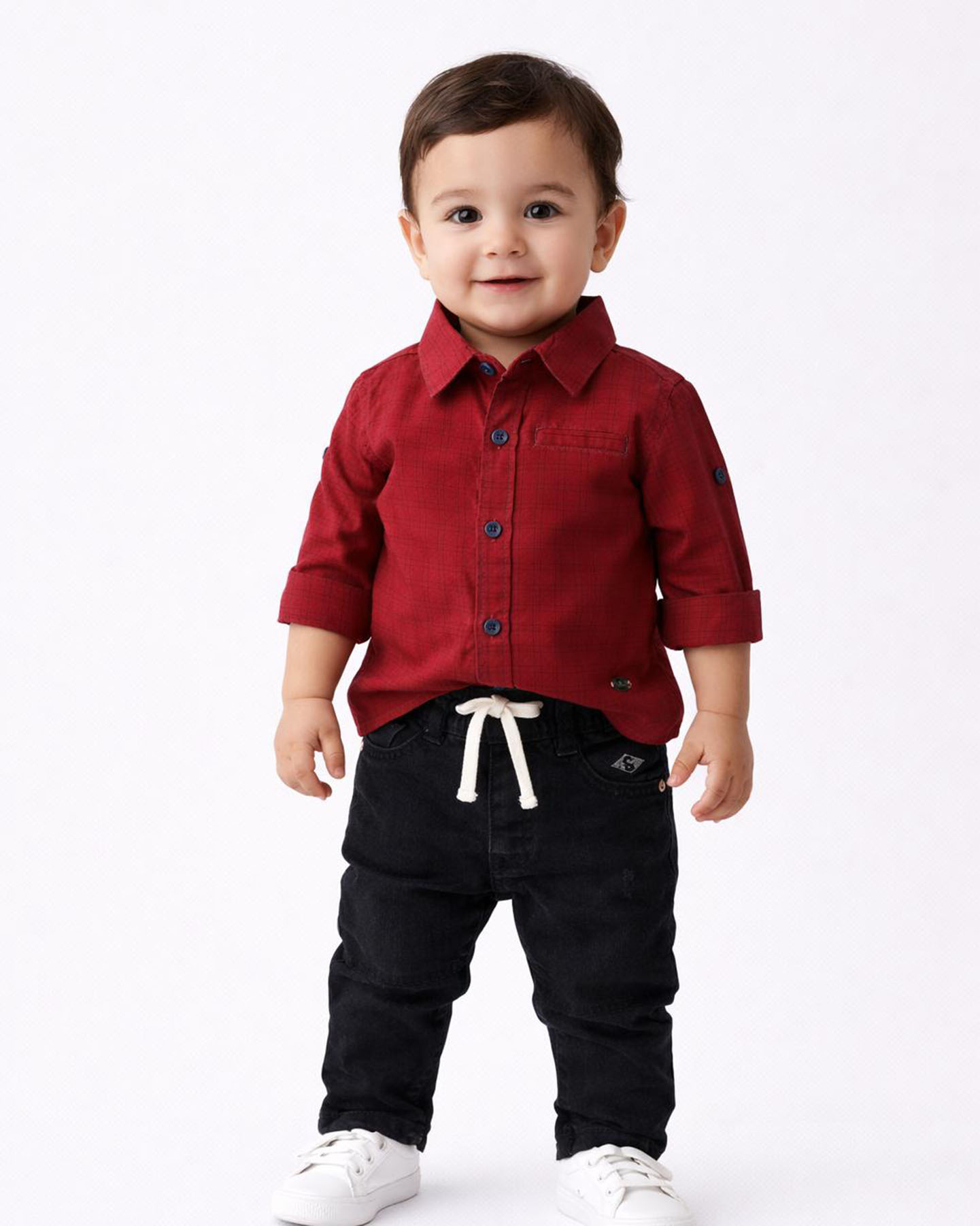 Şık ve modern tasarımıyla öne çıkan kombin seti; kırmızı uzun kollu gömlek ve siyah jean pantolondan oluşur. Yumuşak dokulu kumaşı sayesinde gün boyu konfor sunarken, esnek bel detaylı pantolon pratik kullanım sağlar. Günlük kombinlerde, özel günlerde ve davetlerde rahatlıkla tercih edilebilecek bu takım, minik beylerin stilini tamamlayan zarif bir seçenektir.