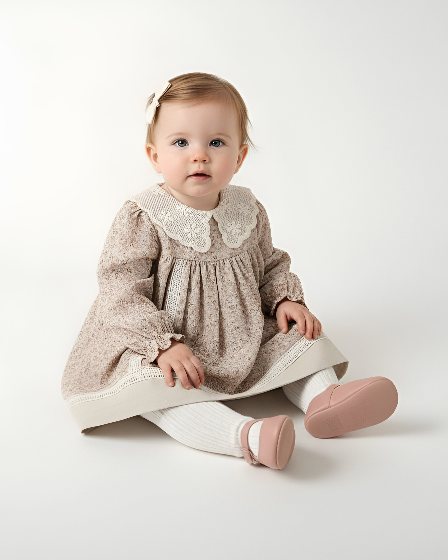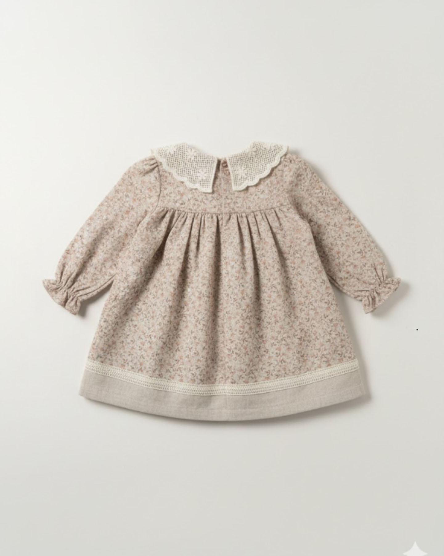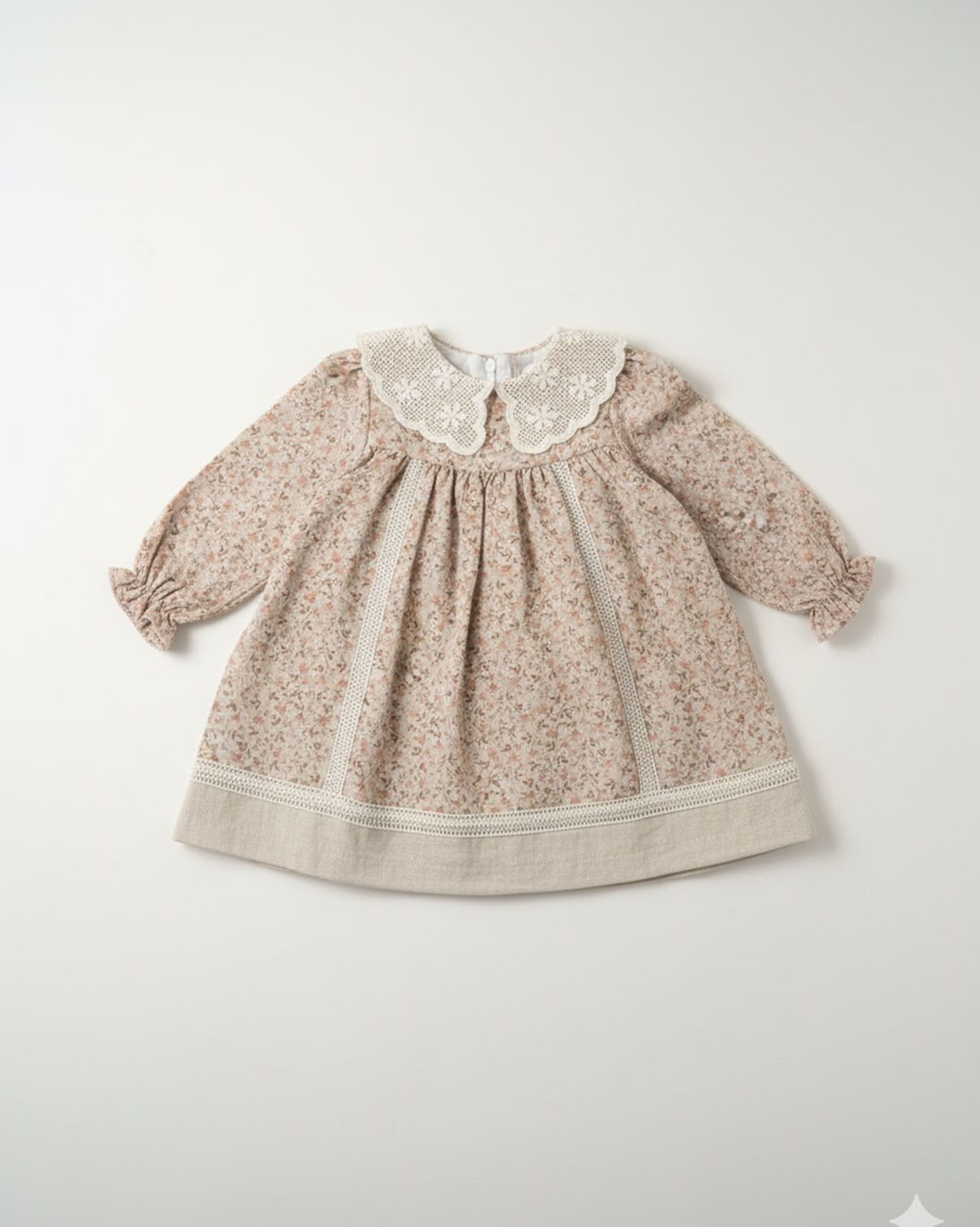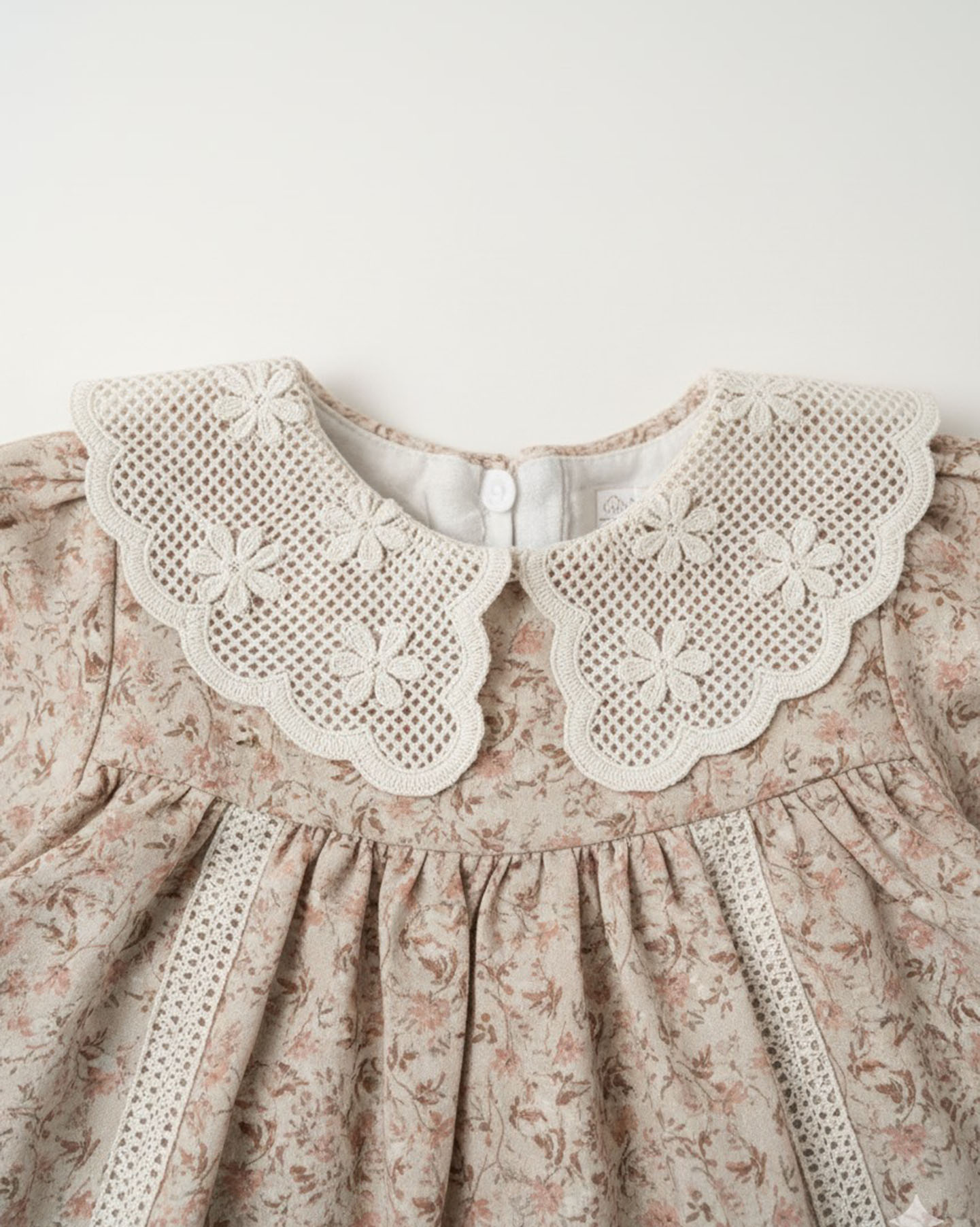 Kız Bebek Çiçek Desenli Dantel Yakalı Uzun Kollu Elbise