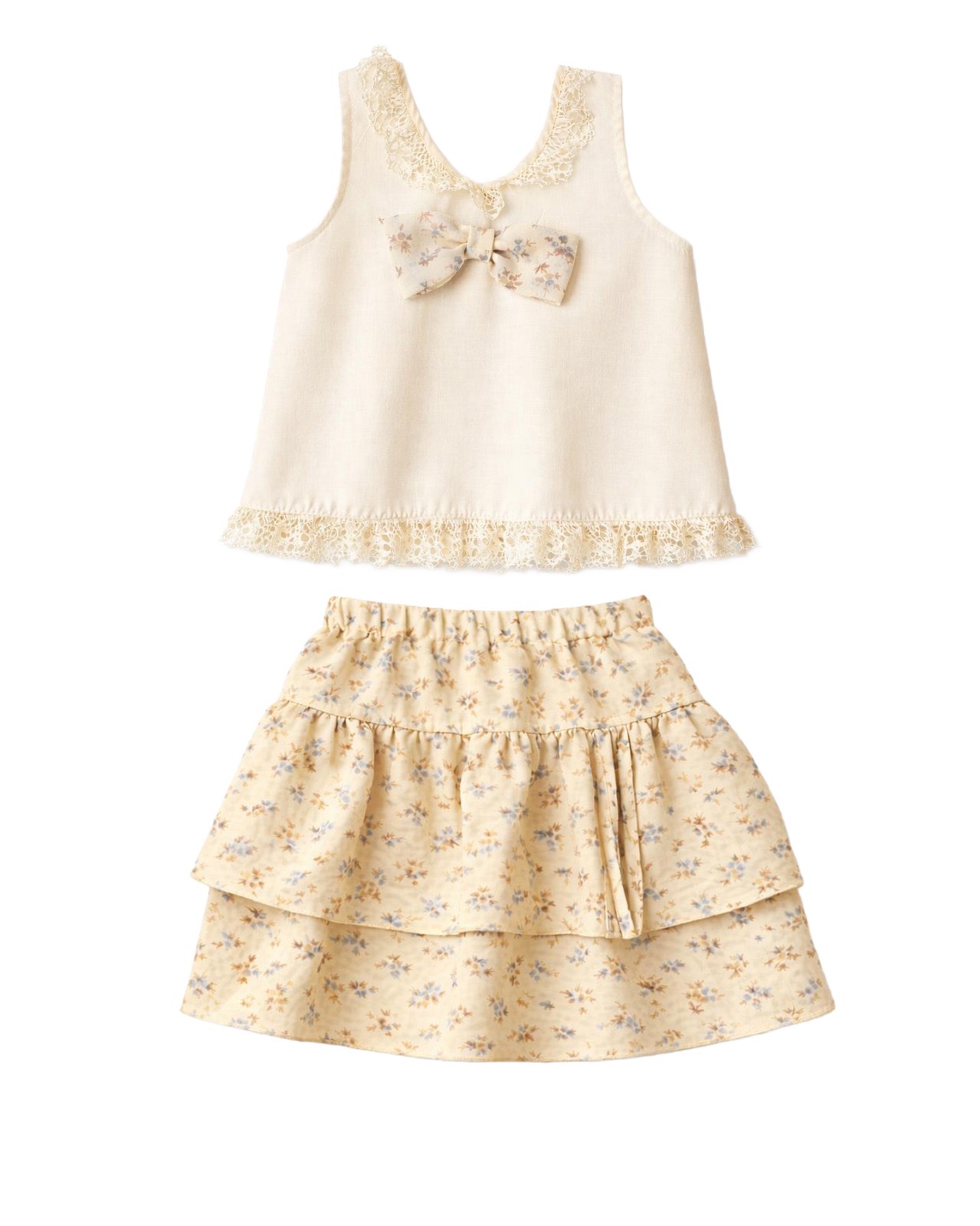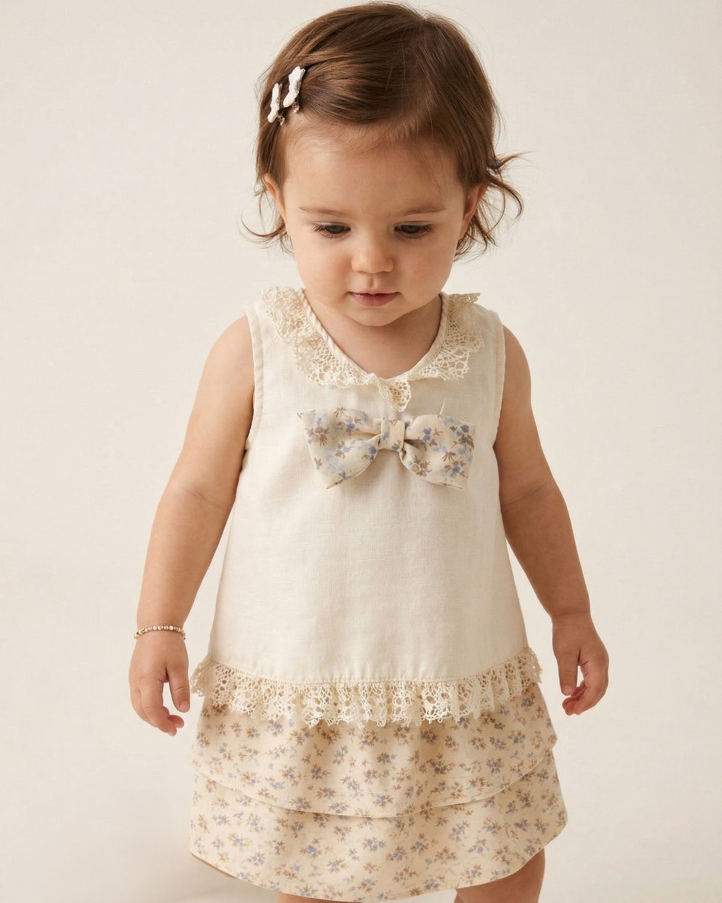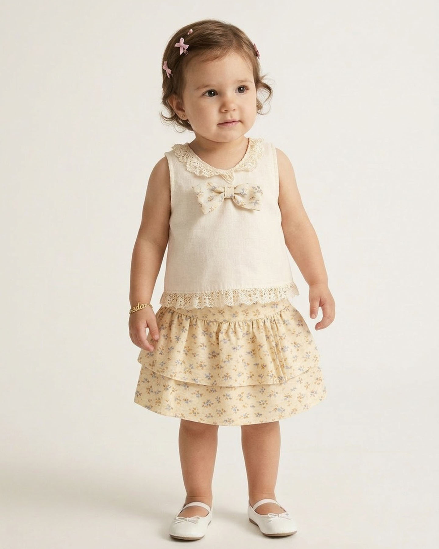 Kız Bebek Dantel Detaylı Önü Fiyonklu Beli Lastikli Kat Etekli Şifon 2’li Takım