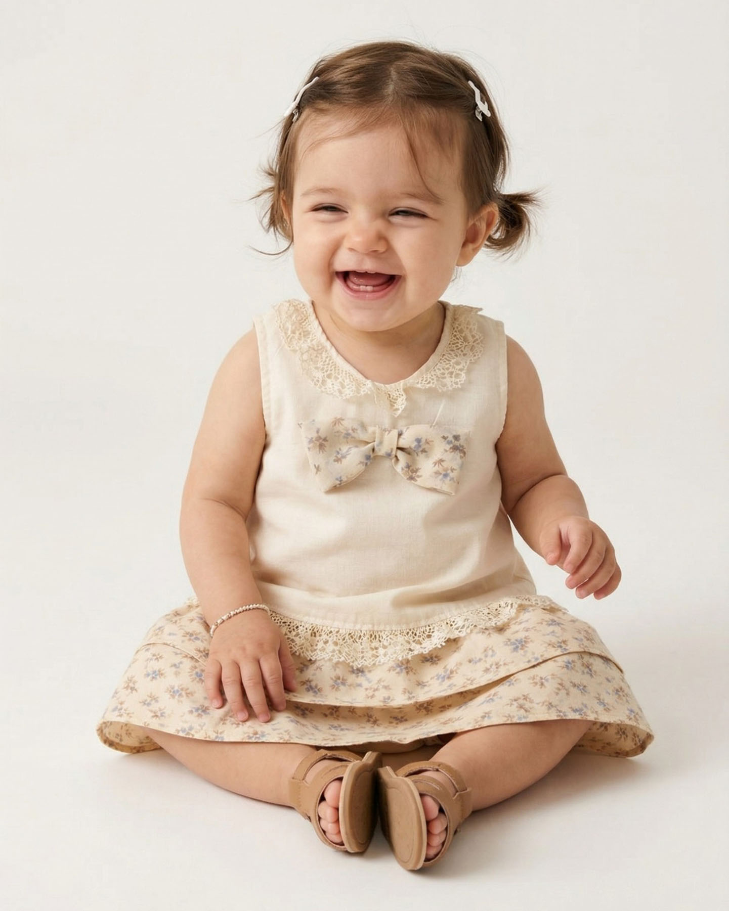 Bu ürünün birden fazla varyasyonu var. Seçenekler ürün sayfasından seçilebilirKız Bebek Bej Renk Beyaz Puantiyeli Dantel Detaylı Elbise