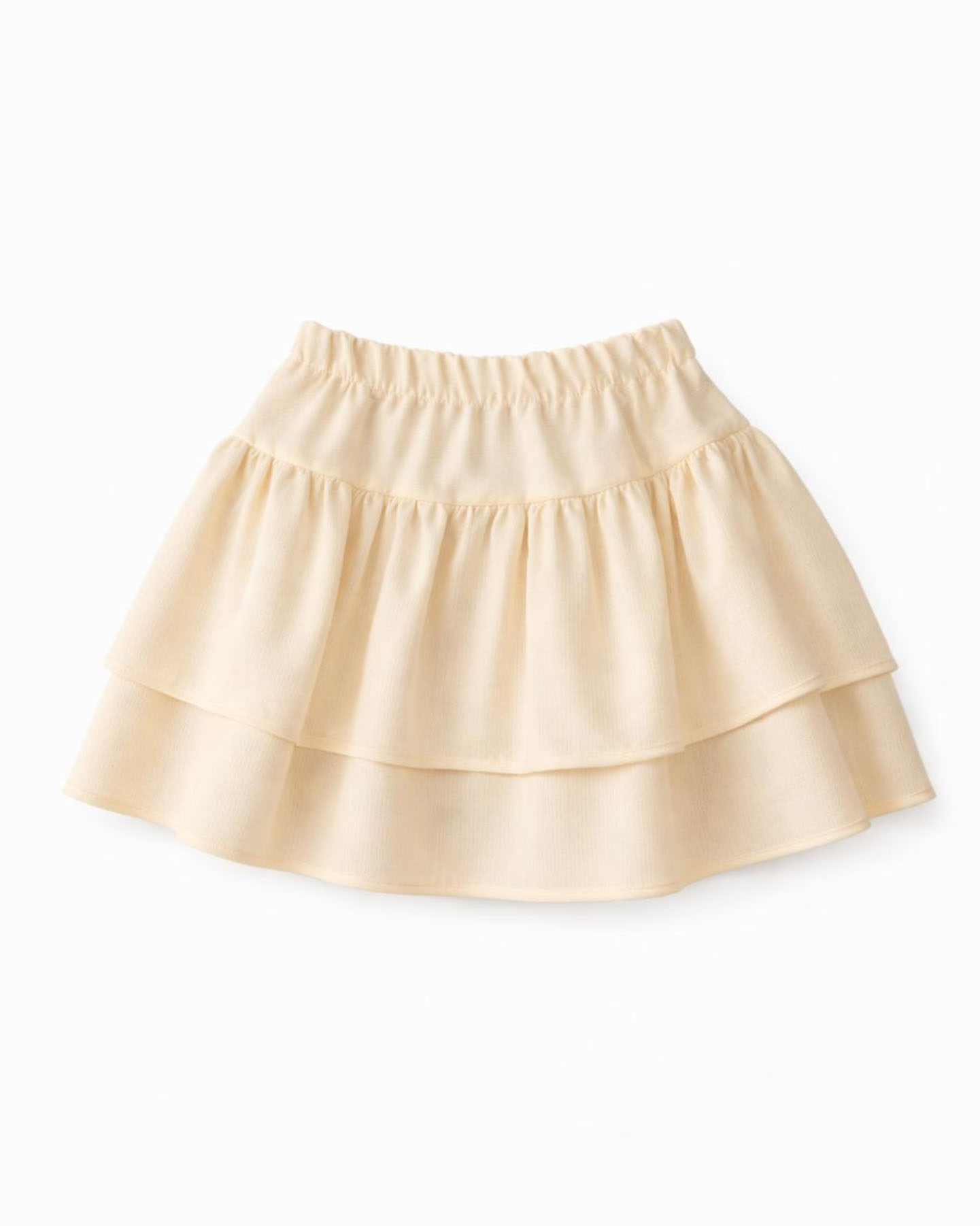 Desenli, fırfır detaylı üst ve kat kat etek tasarımıyla hareketli bir görünüm sağlar.