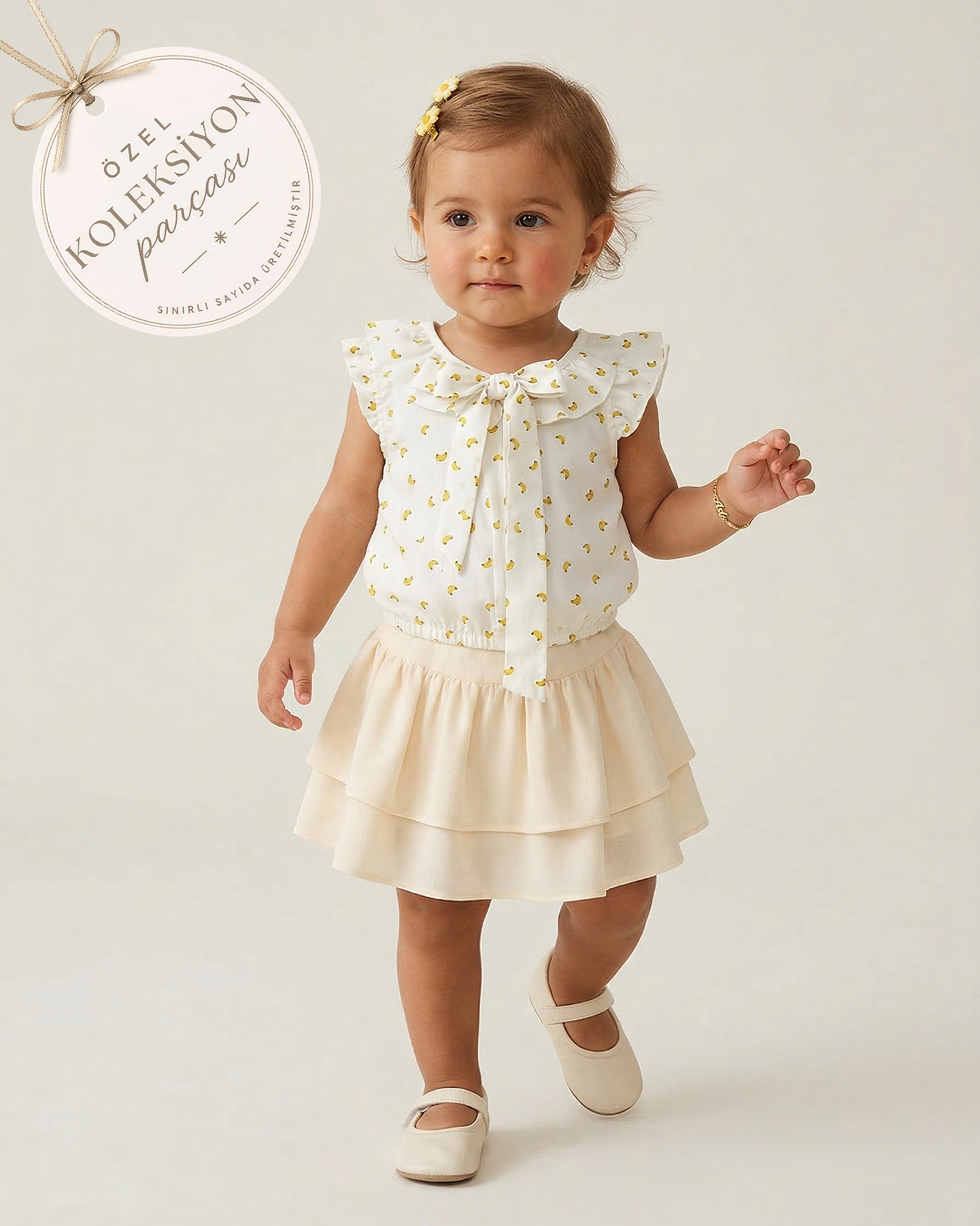 Bu ürünün birden fazla varyasyonu var. Seçenekler ürün sayfasından seçilebilirKız Bebek Ekru Renk İkili Düğme Detaylı Fistolu Şortlu Takım