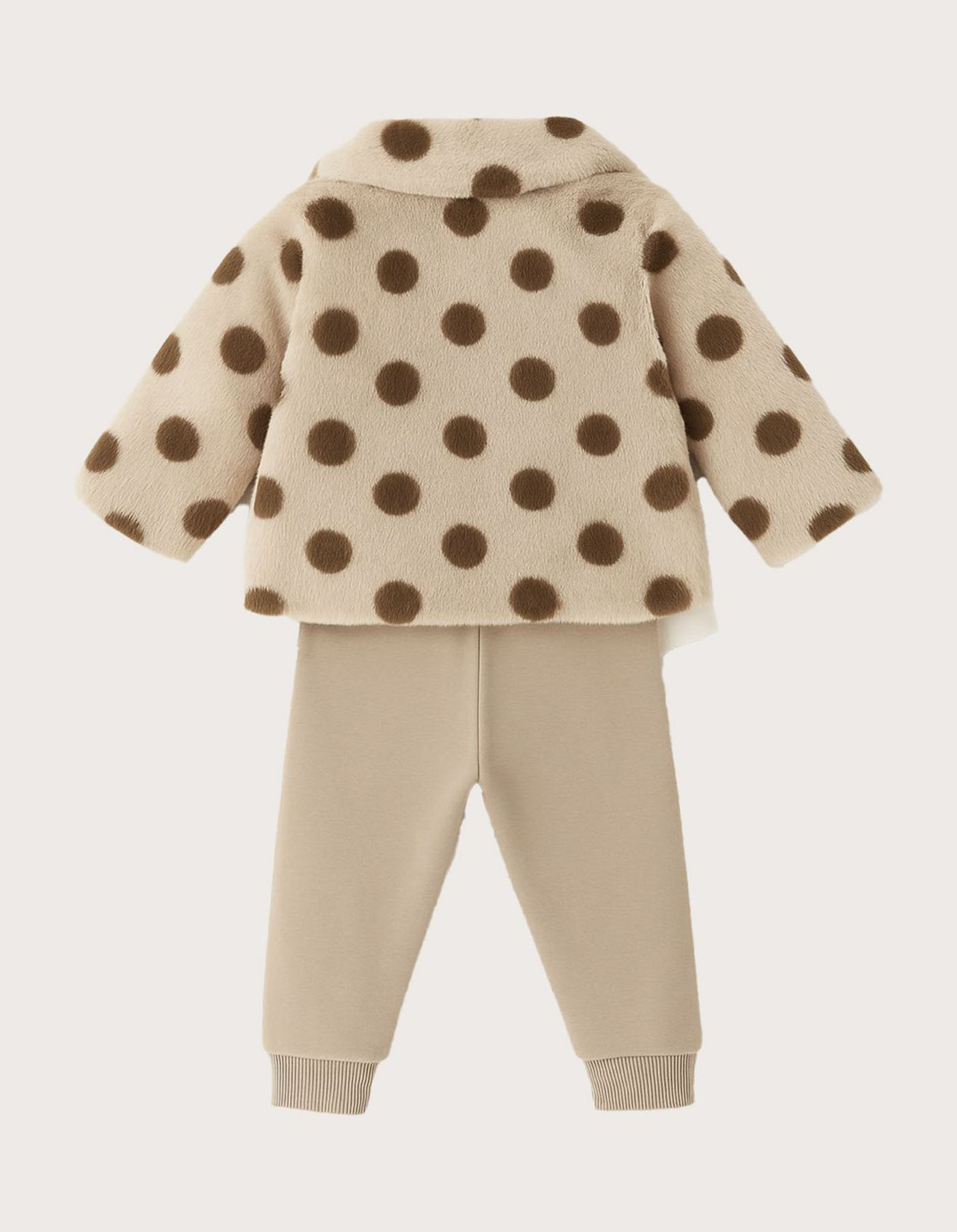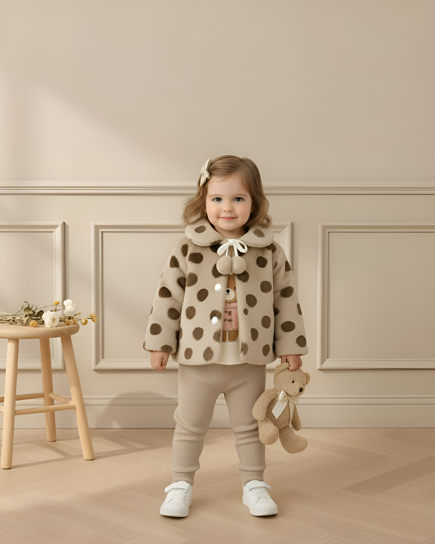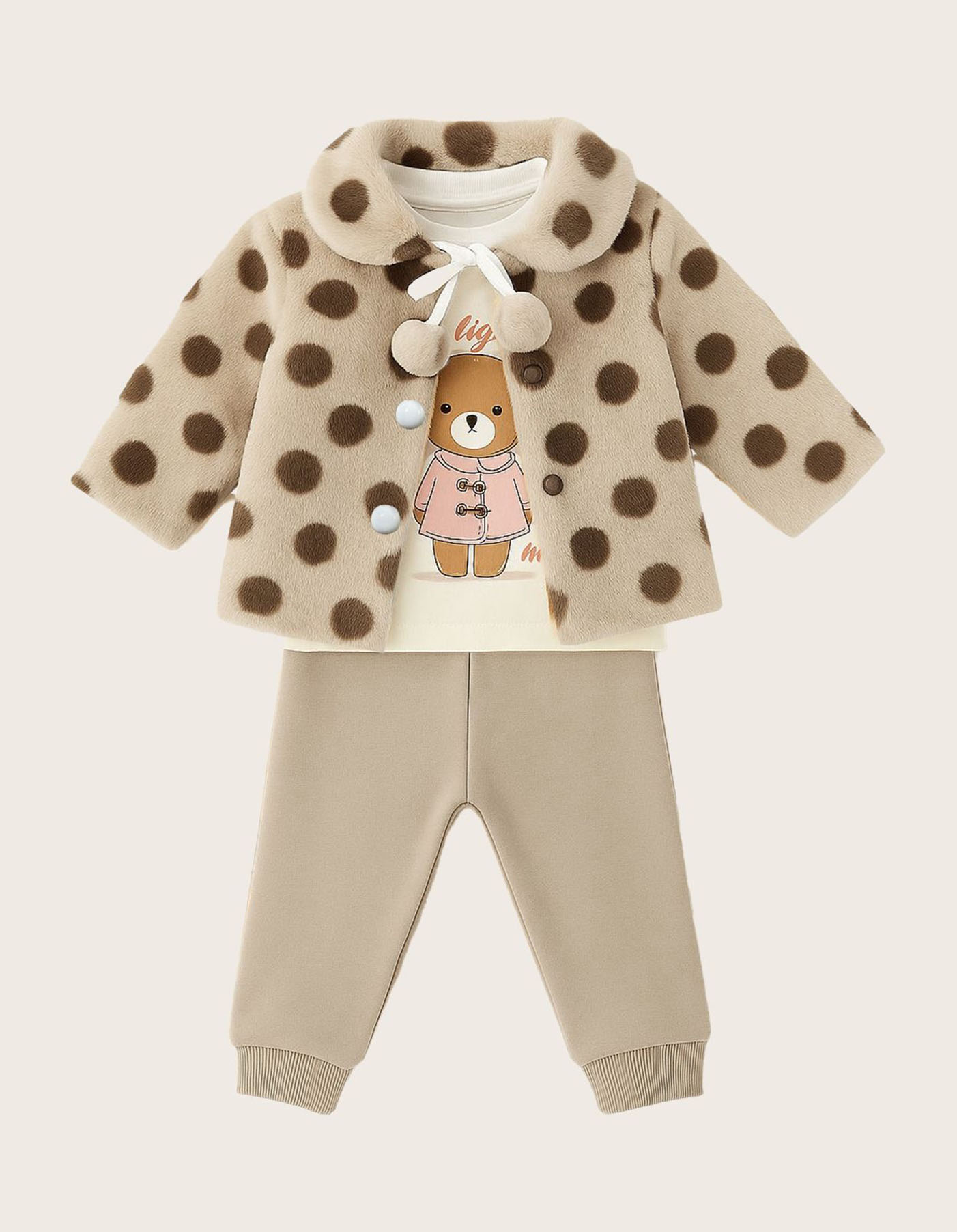 Bu 3’lü bebek takımı; ponpon detaylı puantiyeli peluş mont, sevimli ayıcık baskılı tişört ve rahat eşofman altıyla soğuk havalarda sıcacık ve tarz bir seçim sunuyor. Hem şıklık hem konfor bir arada! Yumuşak dokusuyla miniklerin hassas cildine uygundur, günlük kullanımda ya da dışarıda gezmelerde fark yaratır.