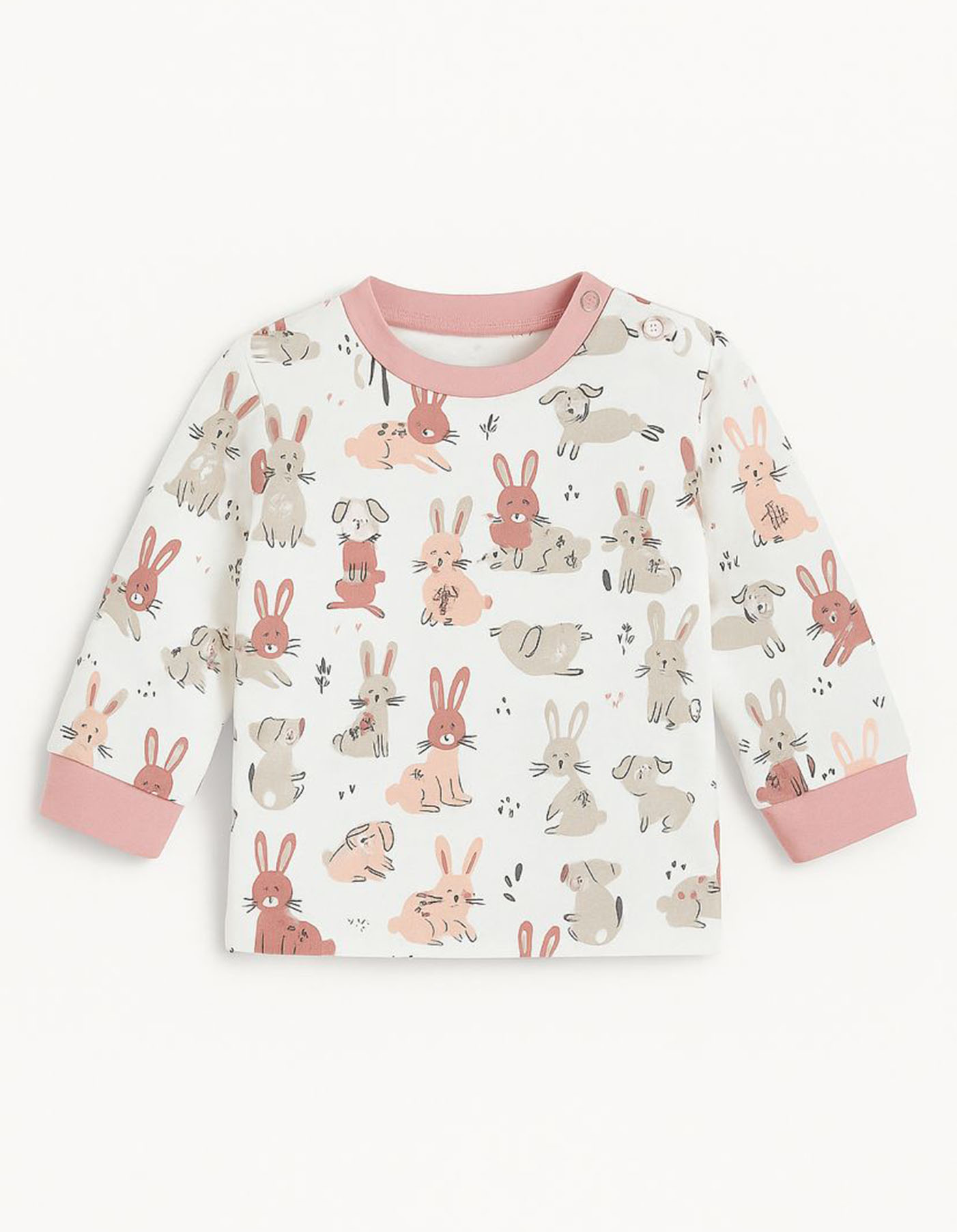 Pastel tonlardaki sevimli tavşan desenleri, hem modern hem de tatlı bir görünüm kazandırırken, omuz kısmındaki çıtçıt detayları bebeğinizi giydirip çıkarmayı  kolaylaştırır.