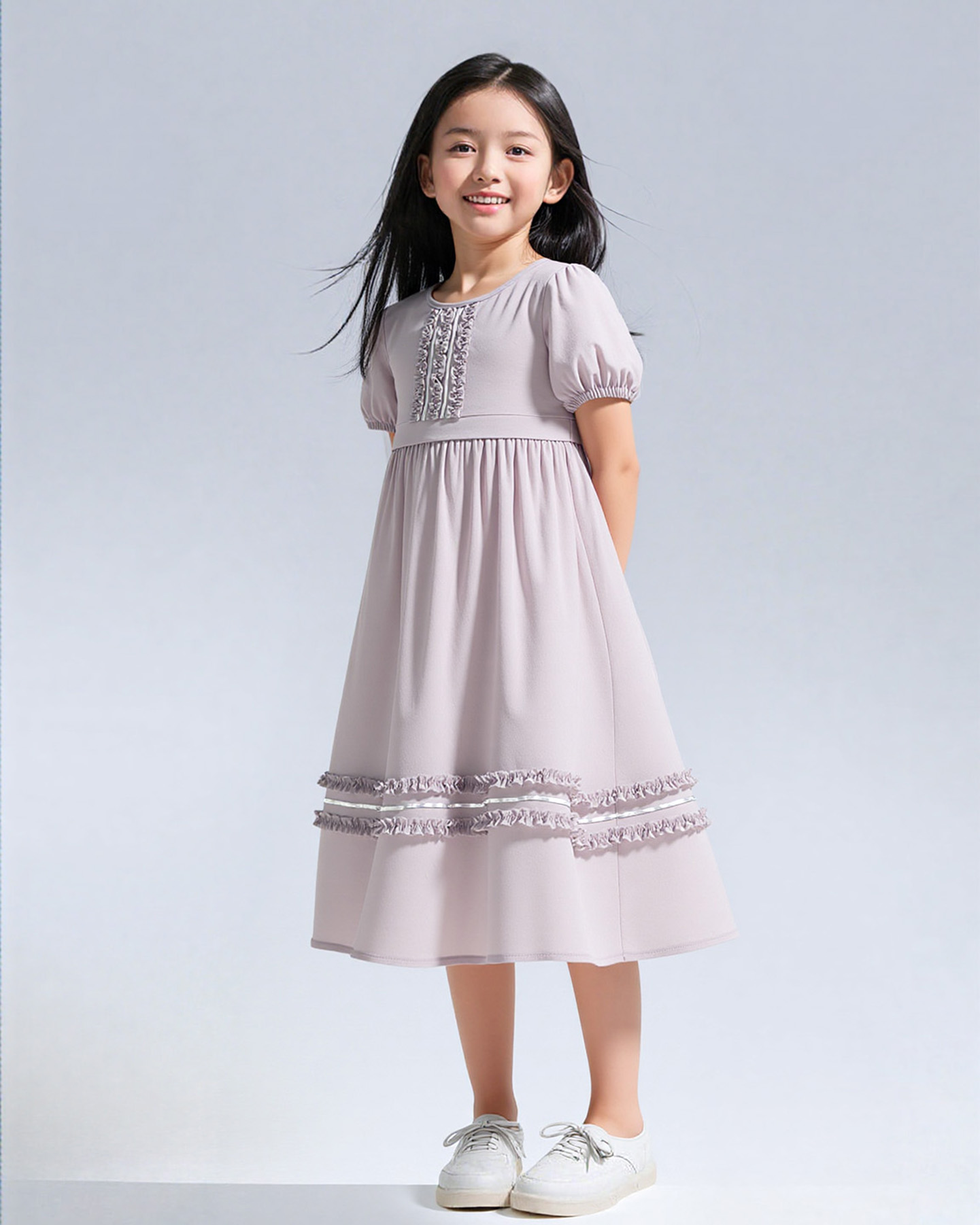 Şıklığı ve zarafeti bir arada sunan bu kız çocuk elbisesi, yaka ve etek