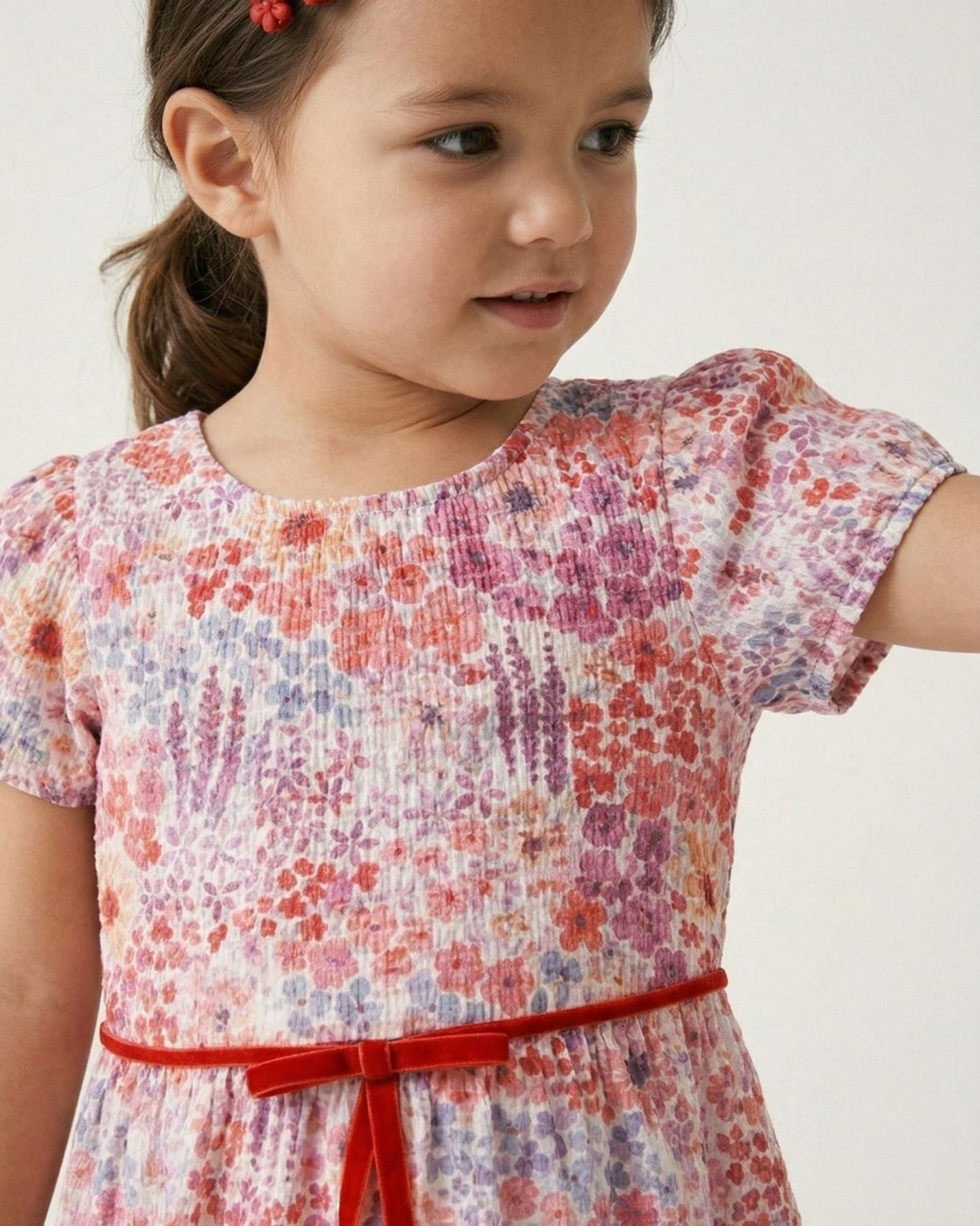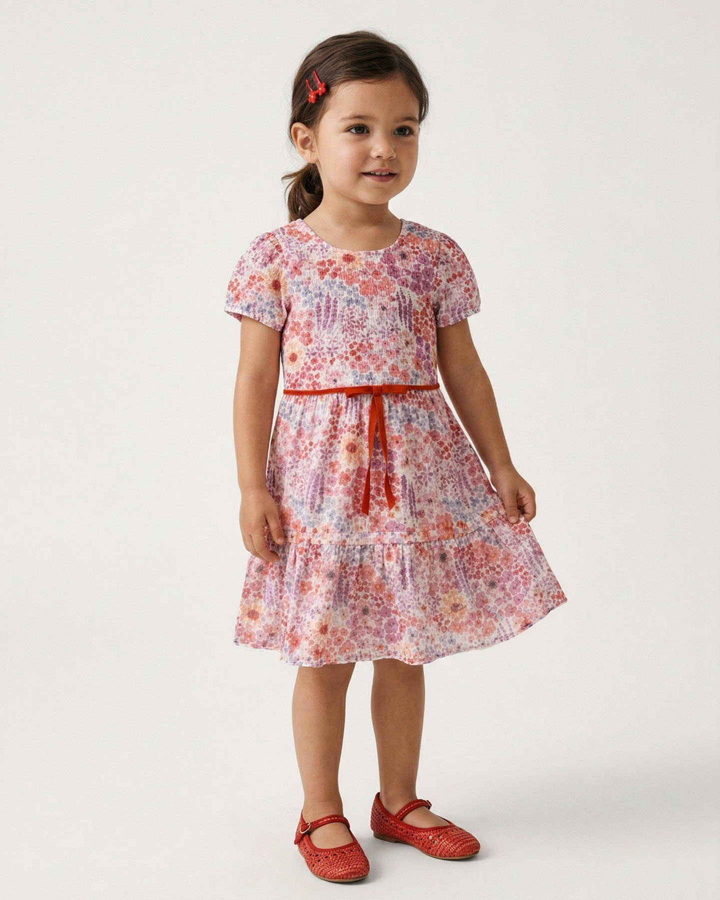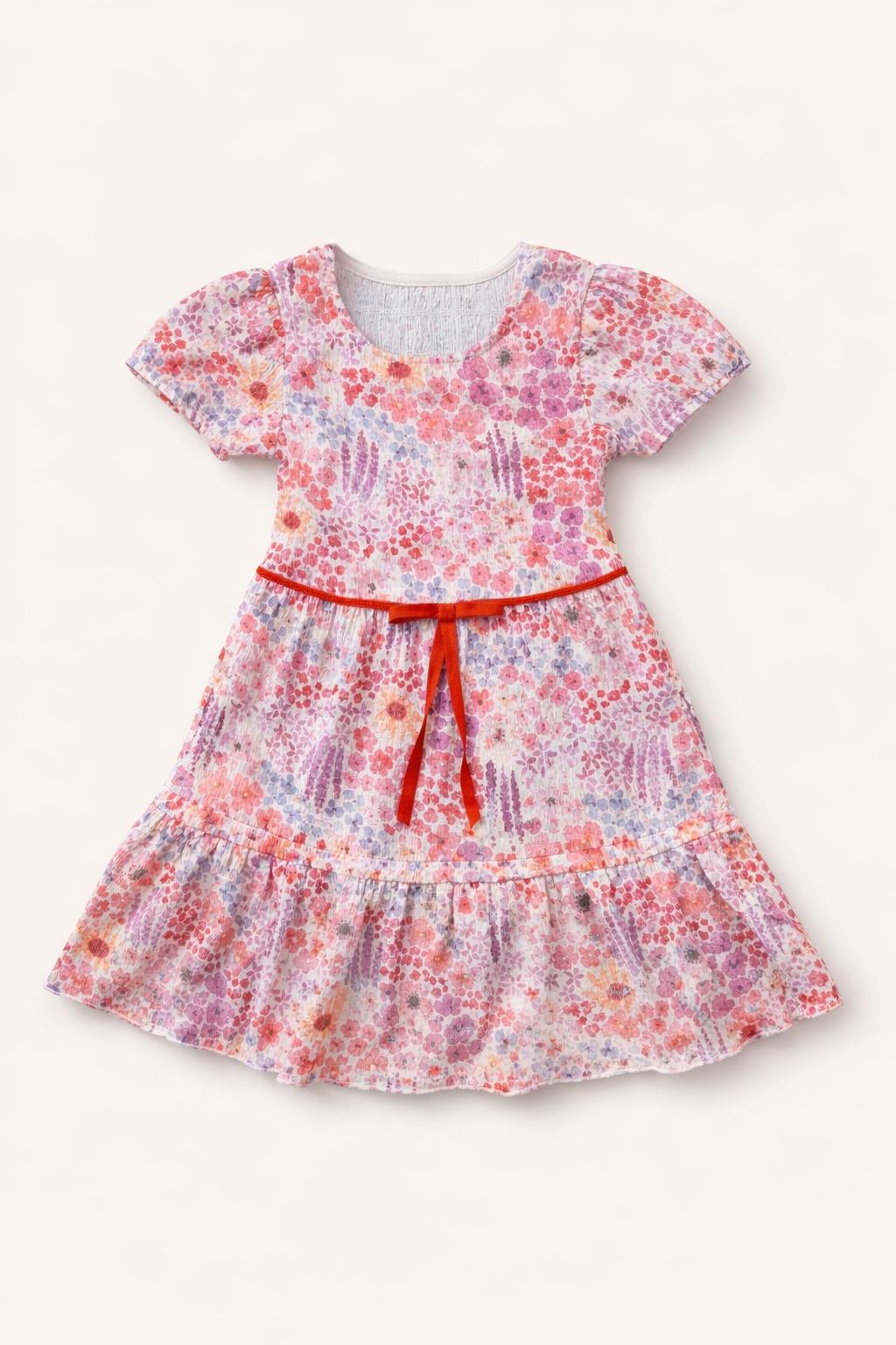 Kız Çocuk Çiçek Desenli Kısa Kollu, Beli Kuşaklı, Yazlık Rahat Elbise