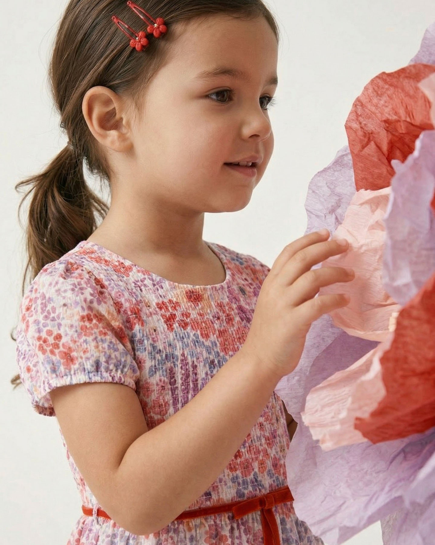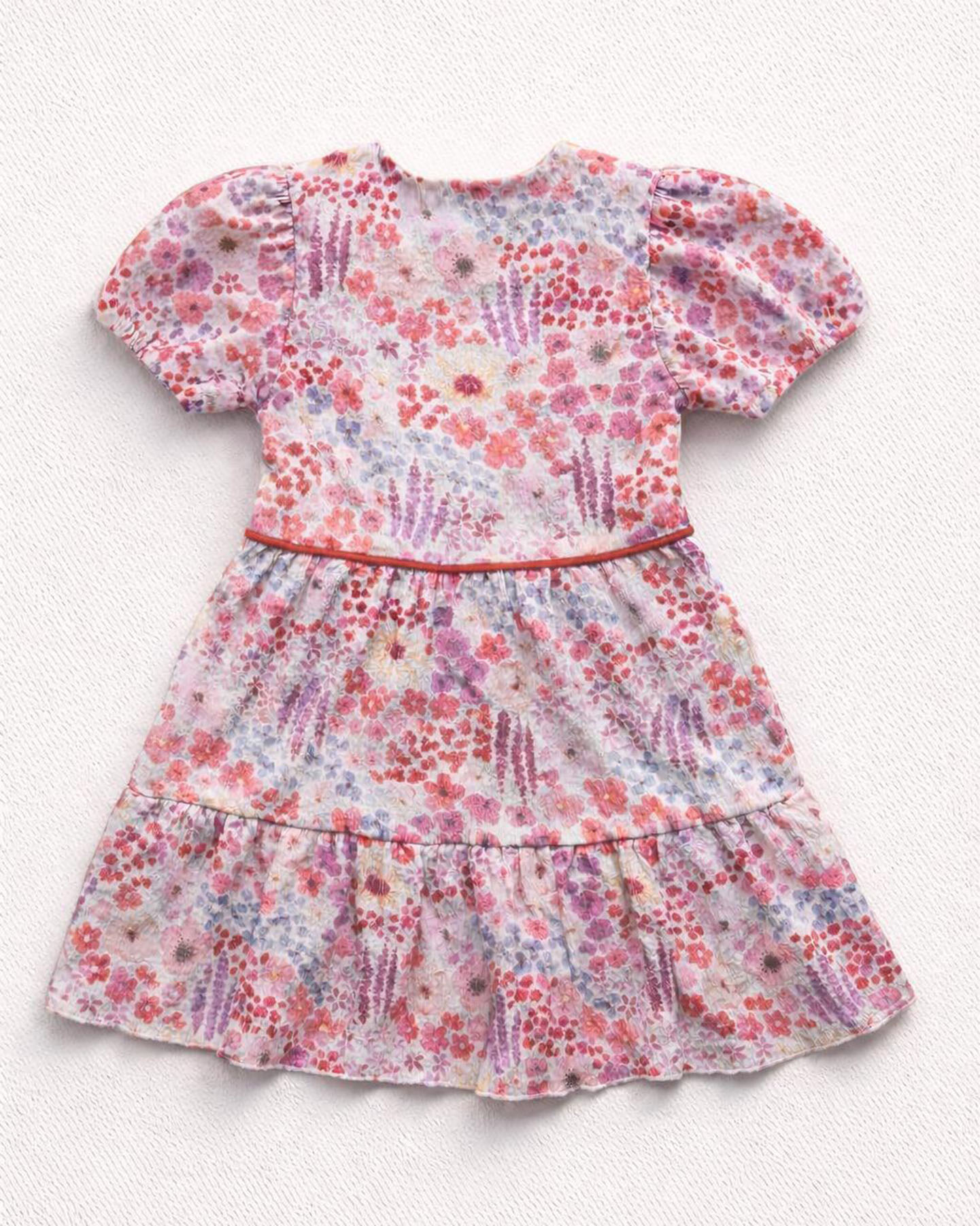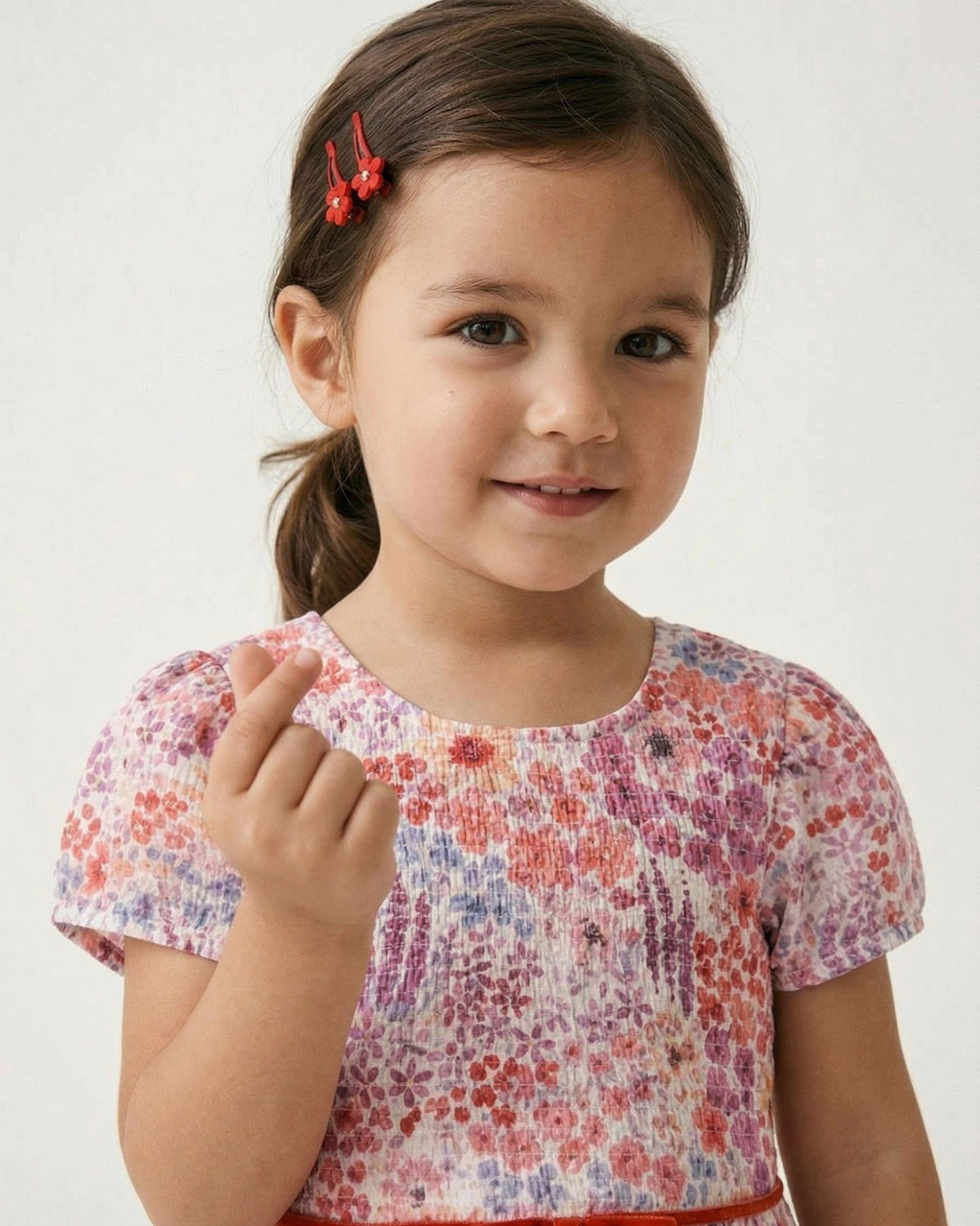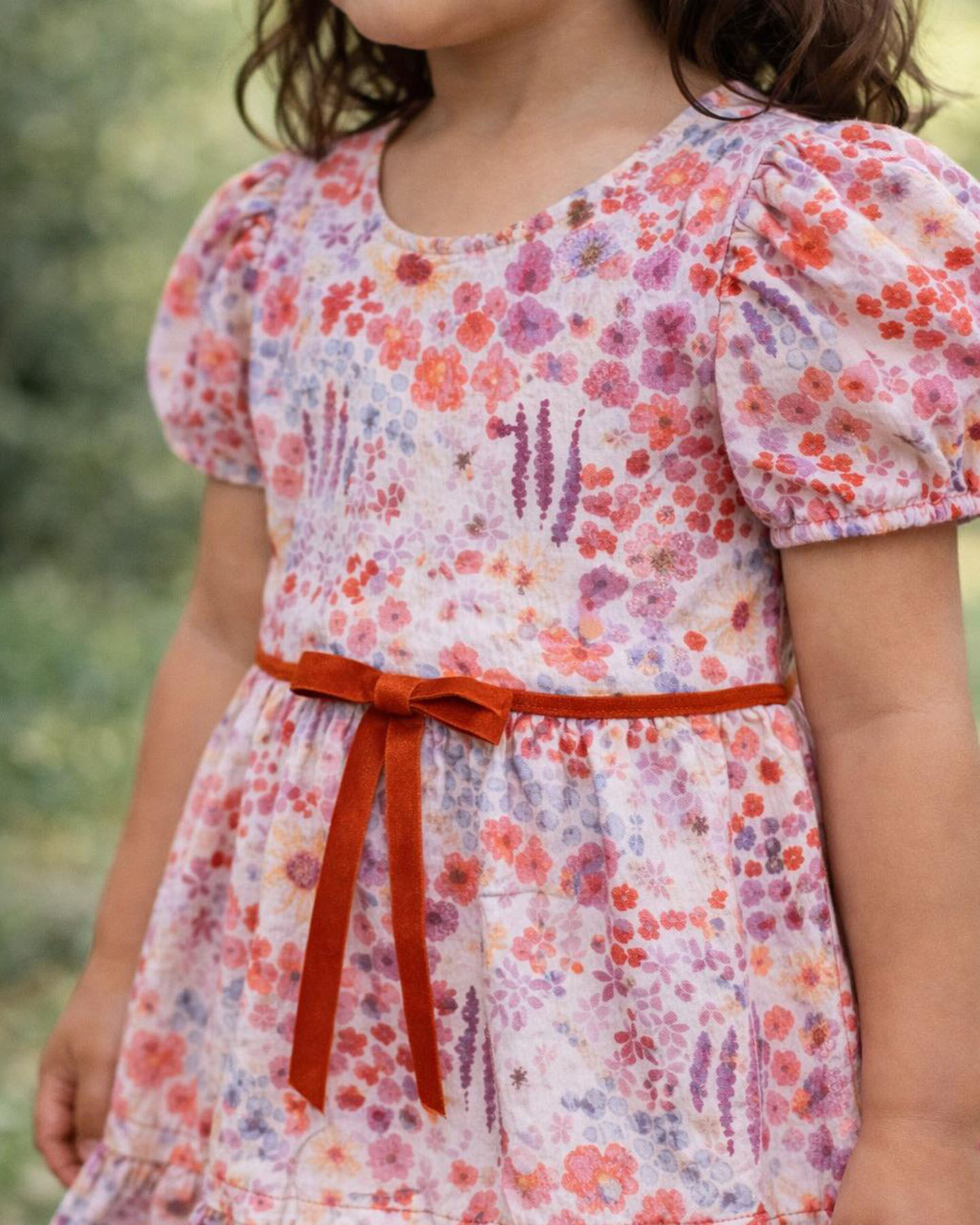 Kız Çocuk Çiçek Desenli Kısa Kollu, Beli Kuşaklı, Yazlık Rahat Elbise