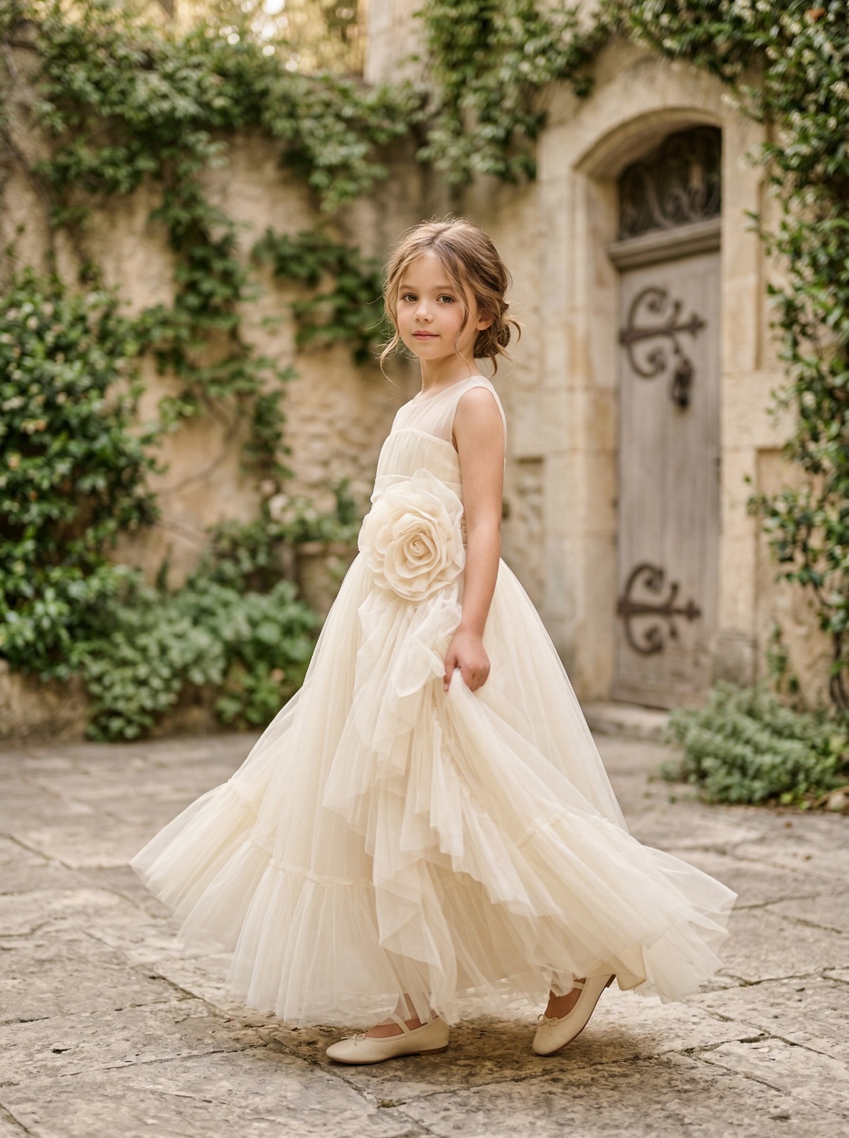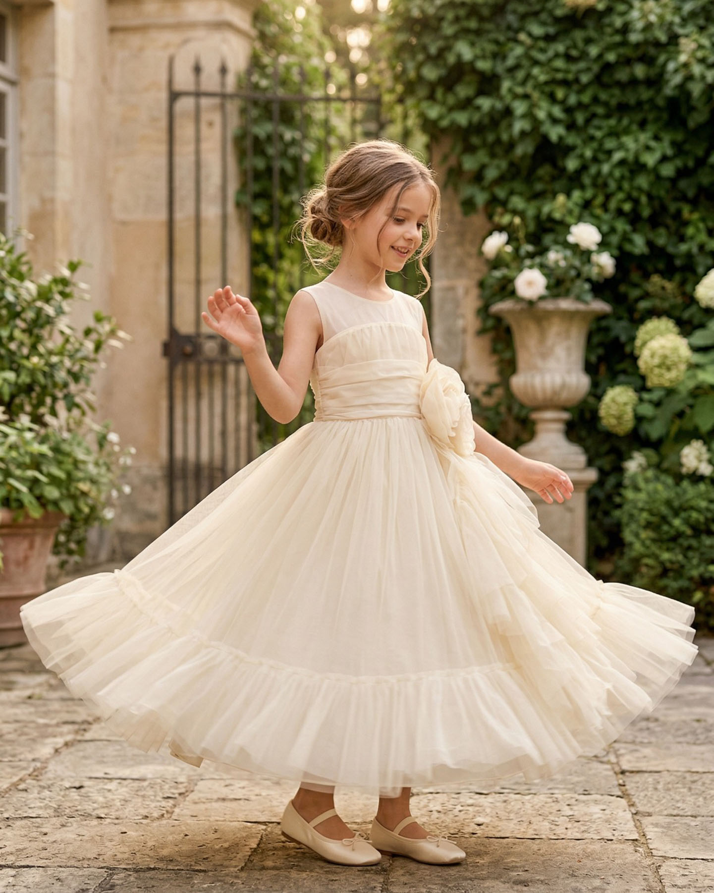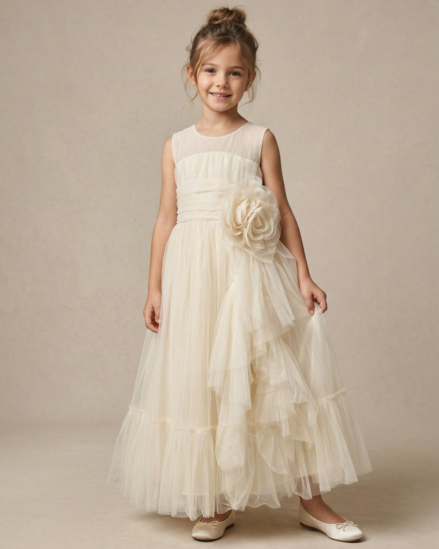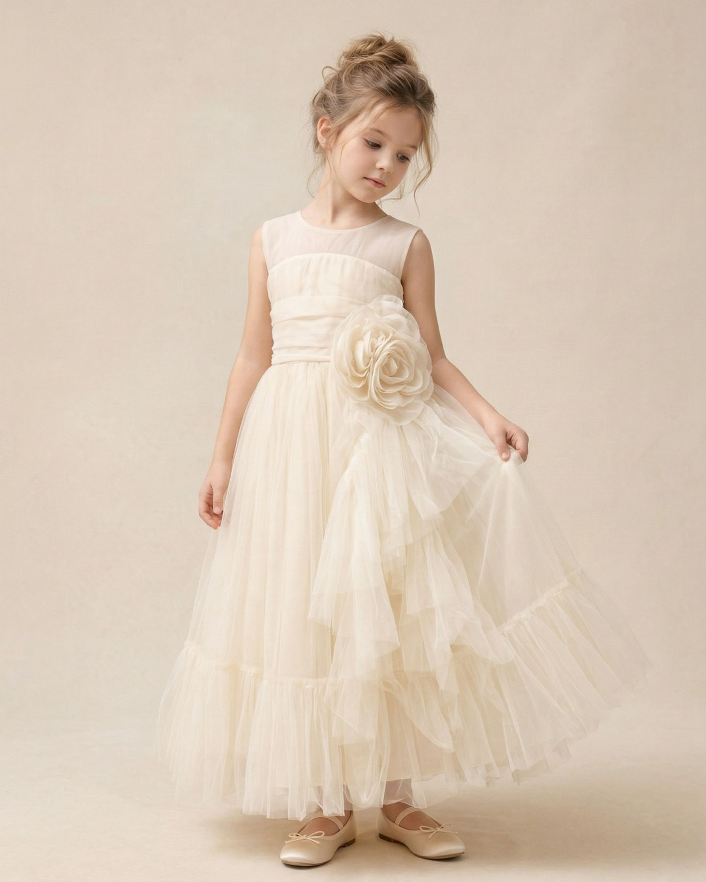 Bu kız çocuk krem midi boy abiye elbise, gül detaylarıyla şıklığı ve zarafeti bir araya getiriyor.