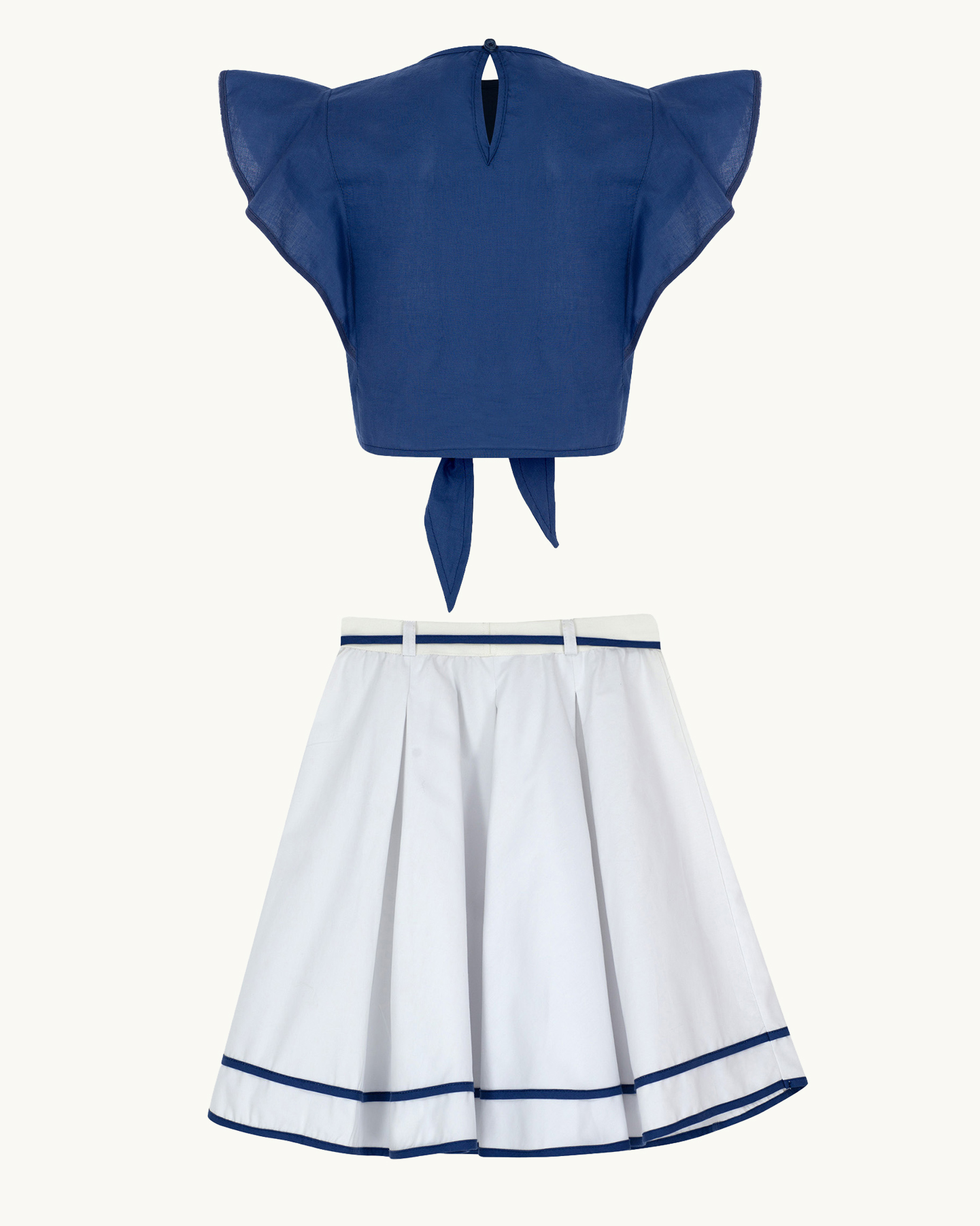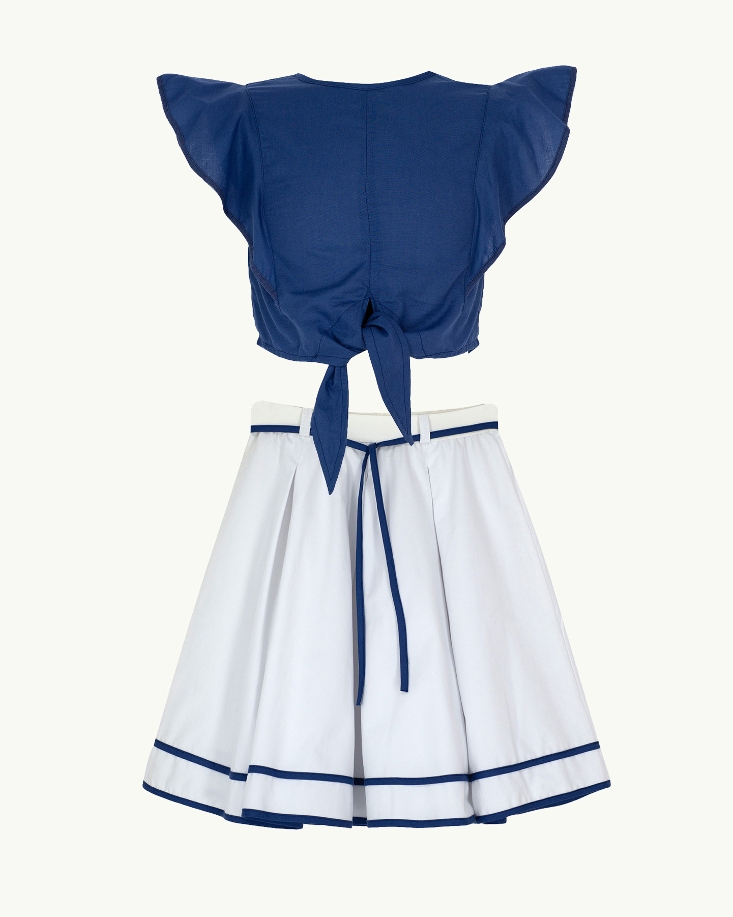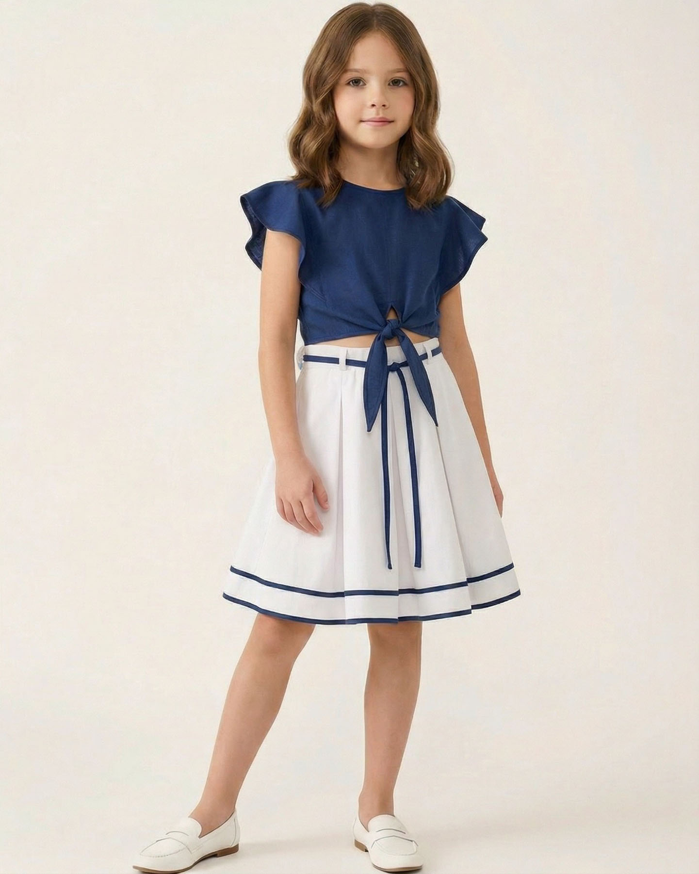 Kız Çocuk Lacivert Bağlamalı Bluz ve Beyaz Pileli Etek Takımı – Şık ve Rahat Yazlık Kombin