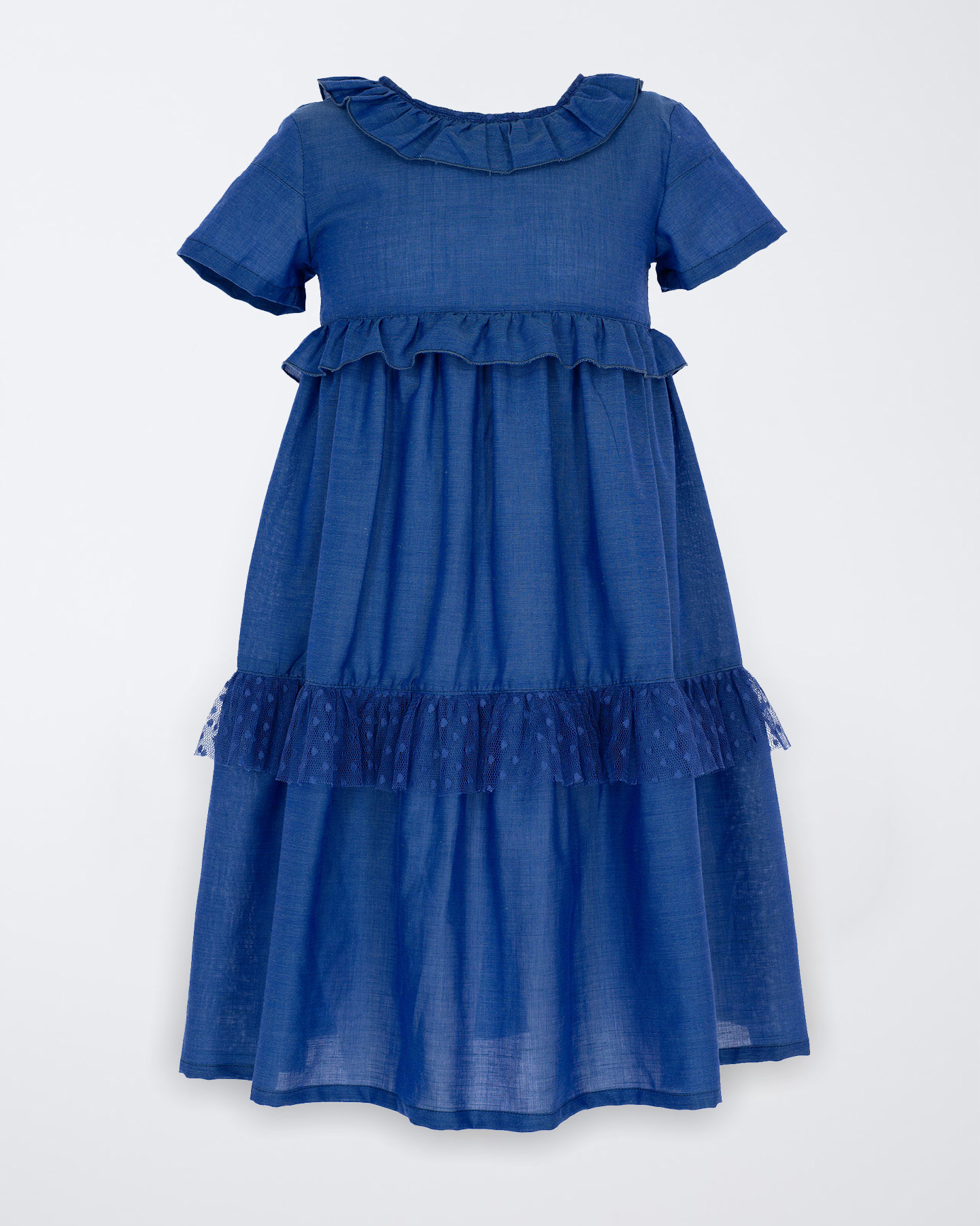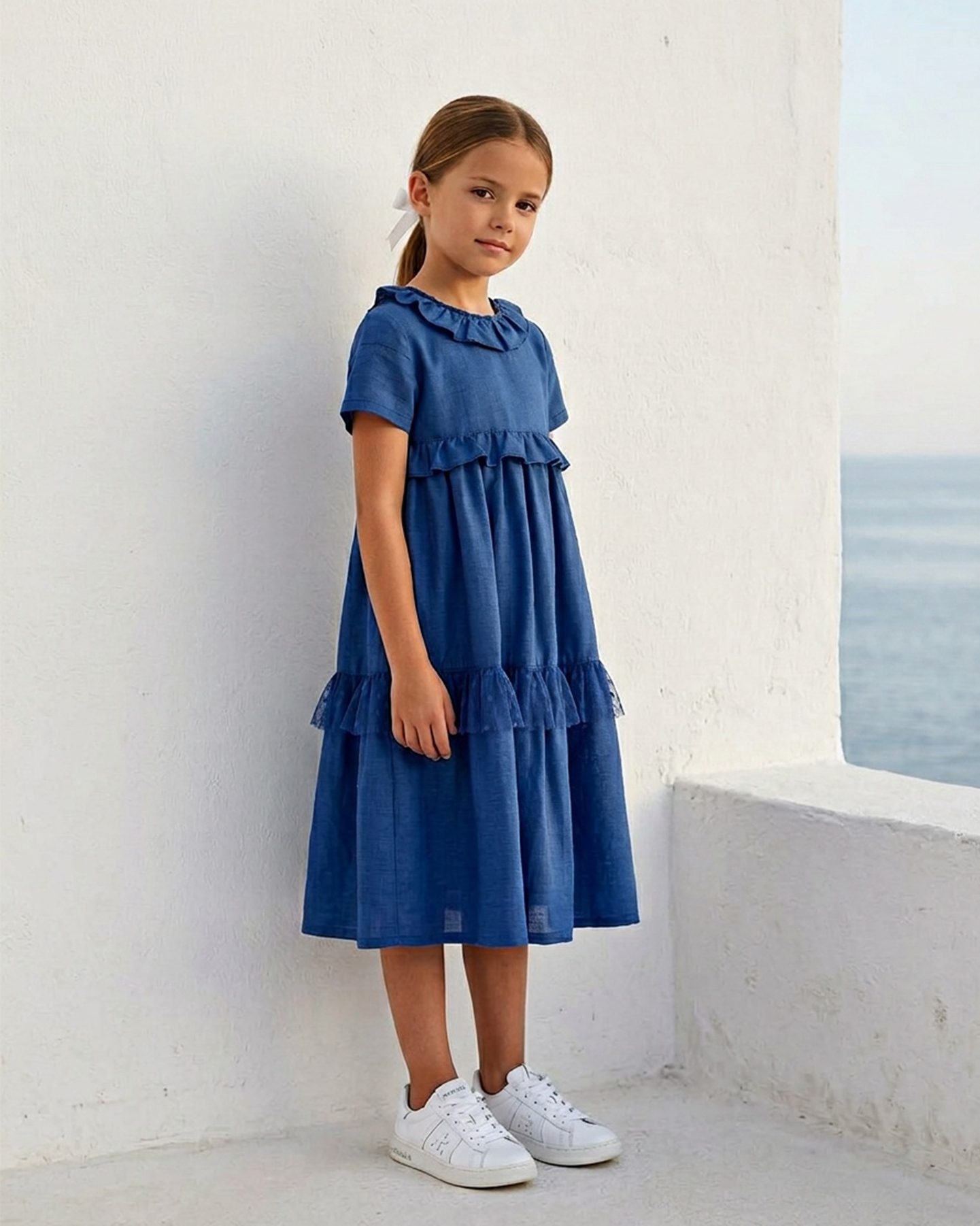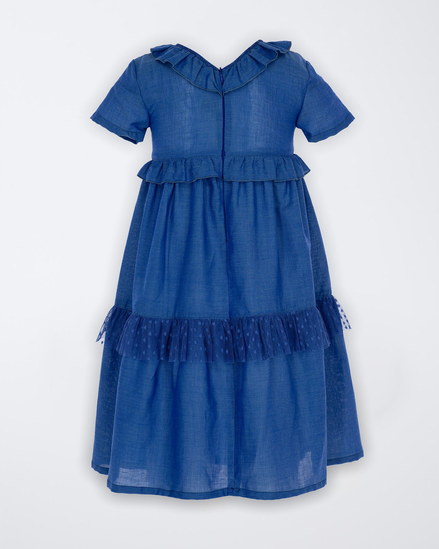Kız Çocuk Mavi Renk Keten Yakası Fırfır Detaylı Elbise