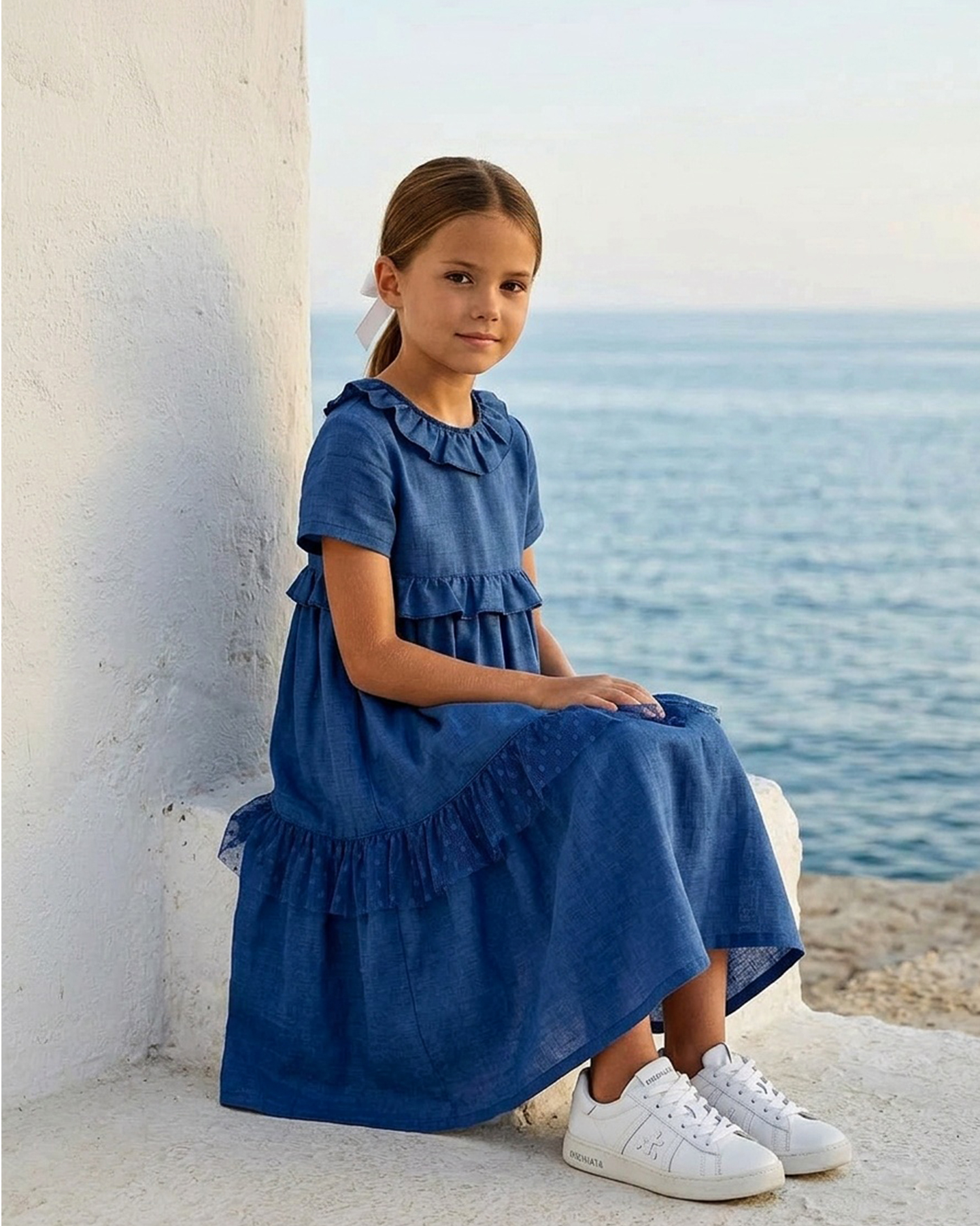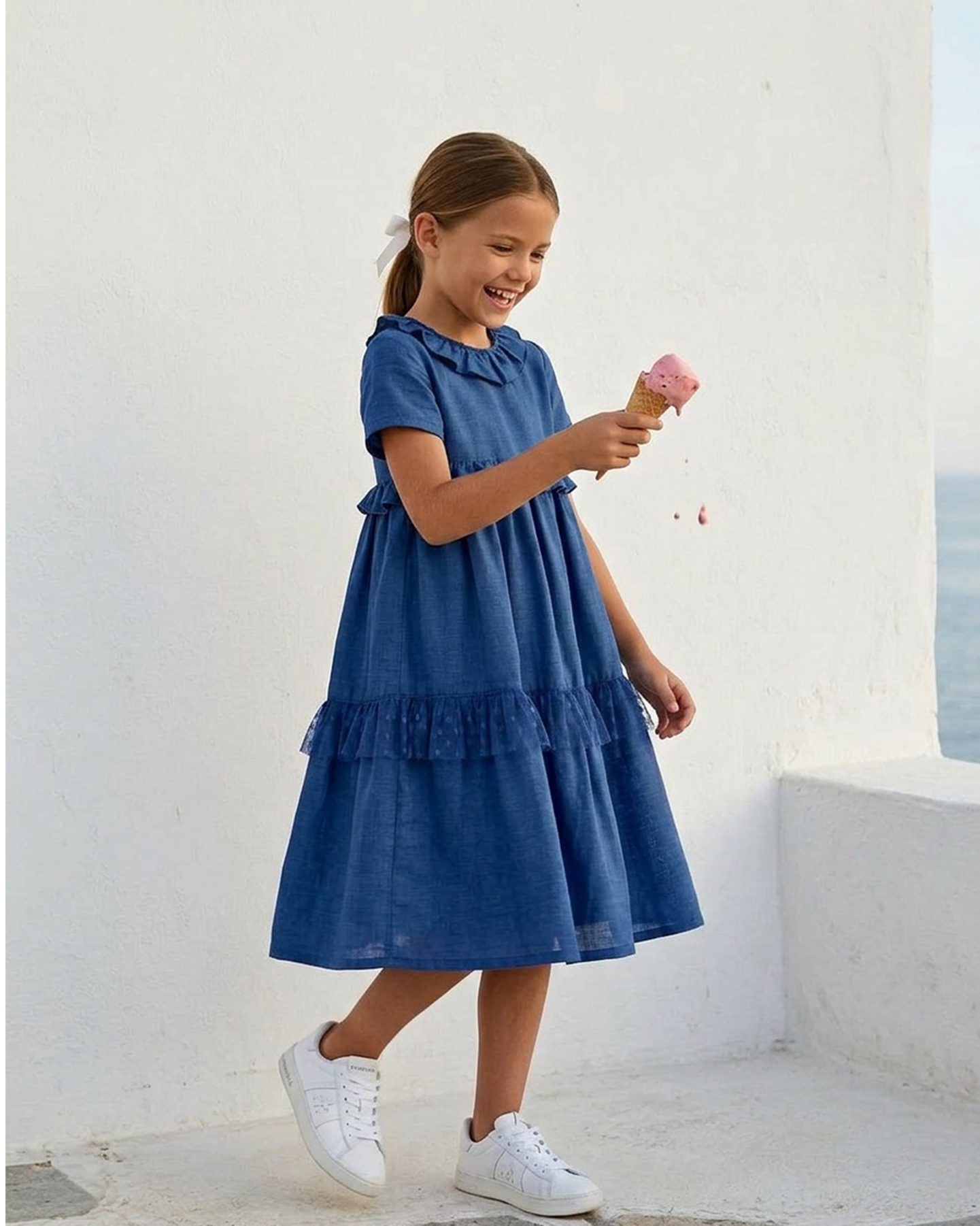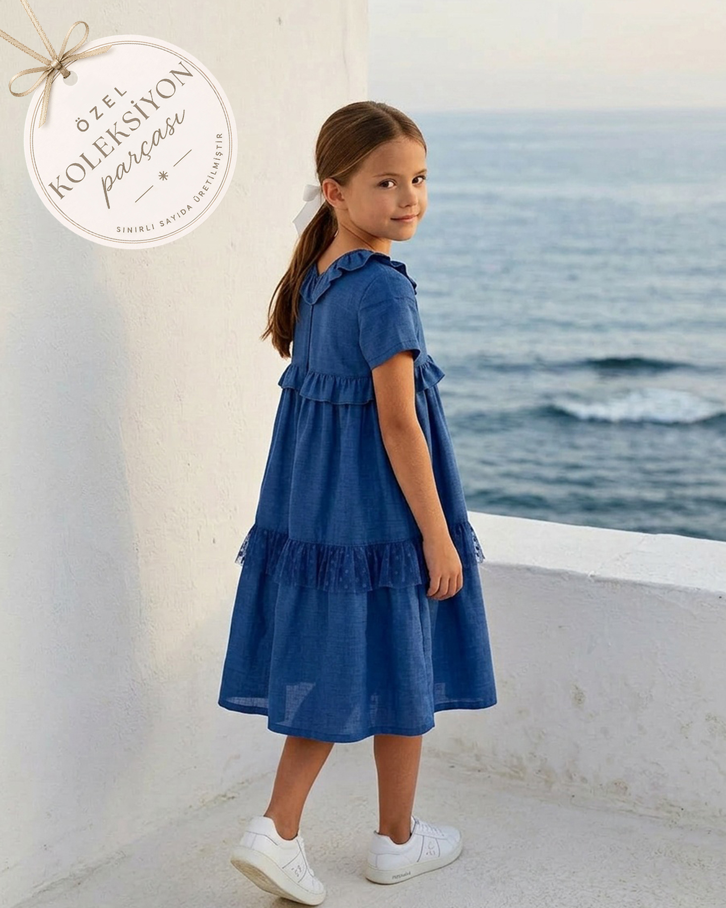 Kız Çocuk Mavi Renk Keten Yakası Fırfır Detaylı Elbise için 1 değerlendirme