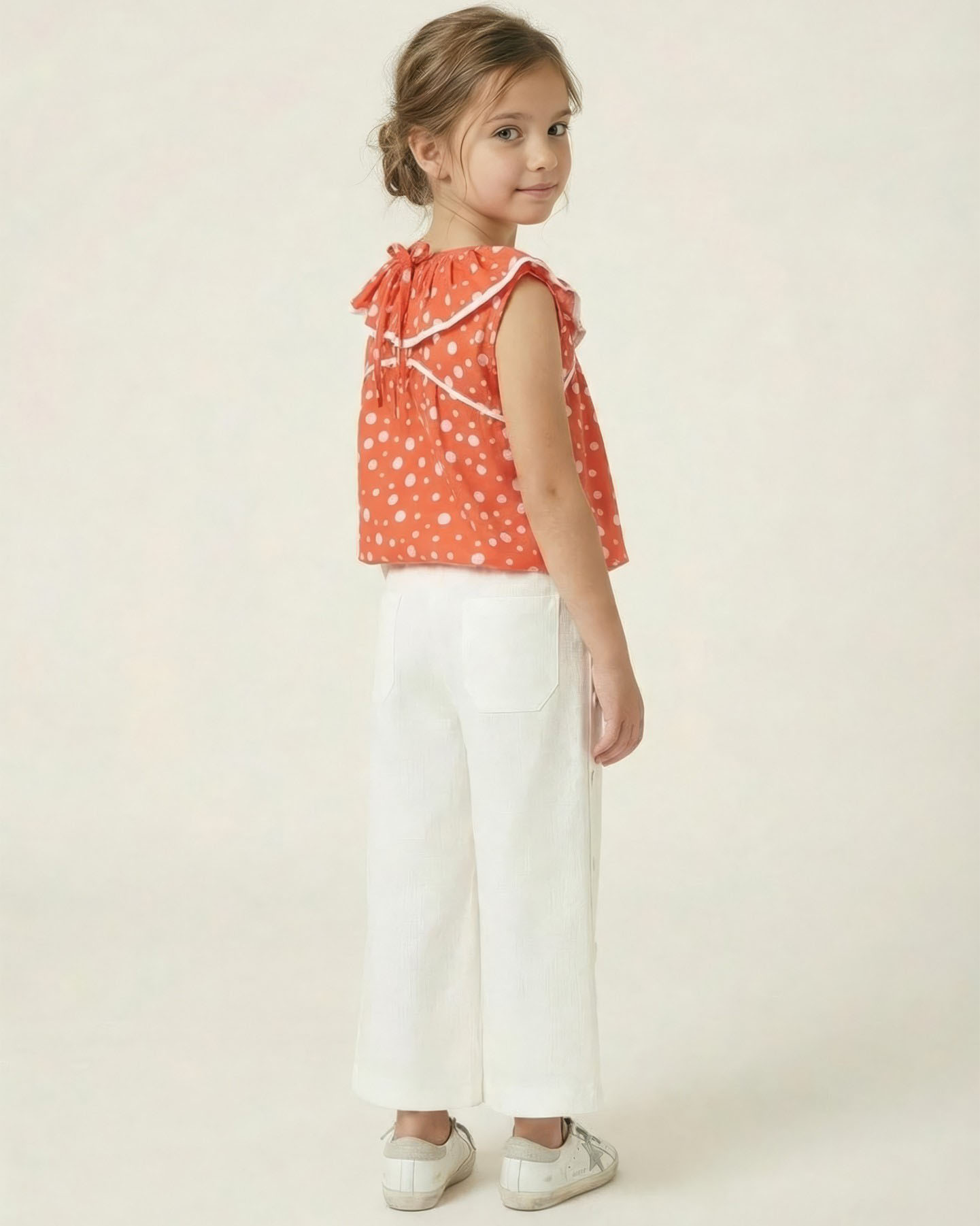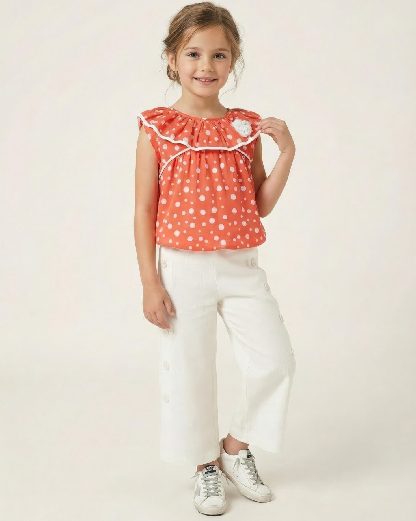 Enerjik turuncu puantiyeli bluz ve modern kesime sahip ekru bol paça pantolon ile tasarlanan bu kız çocuk takımı, hem günlük kullanım hem de özel günler için ideal bir şıklık sunar. Fırfır yaka detayı ve zarif çiçek aksesuarı ile hareketlenen bluz, rahat kalıbı sayesinde gün boyu konfor sağlar. Yan düğme detaylı pantolon ise stil sahibi bir görünüm kazandırırken özgürce hareket imkânı sunar.