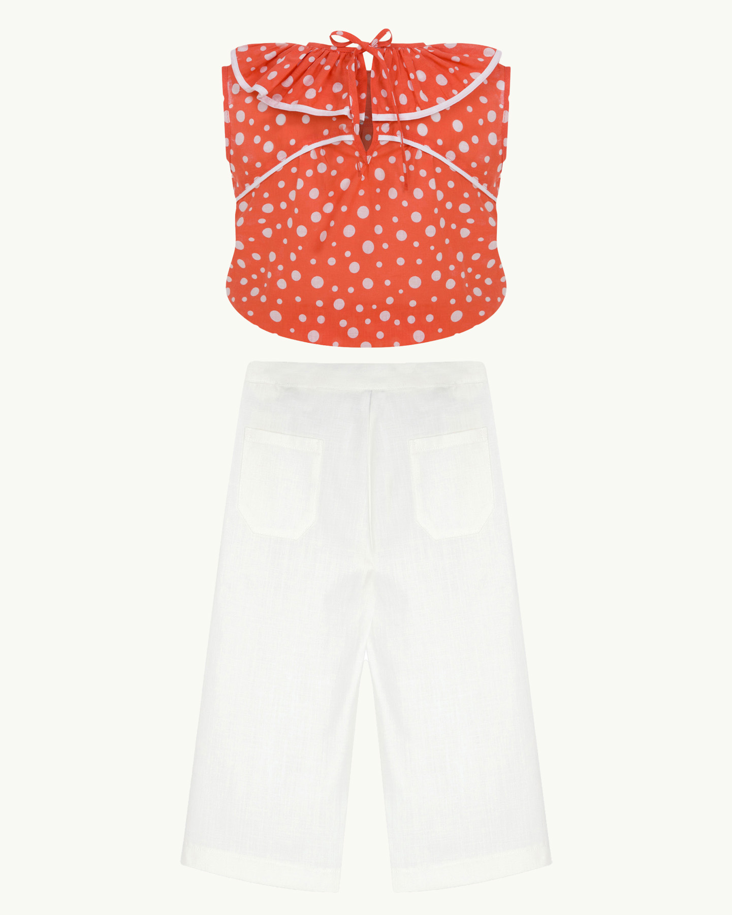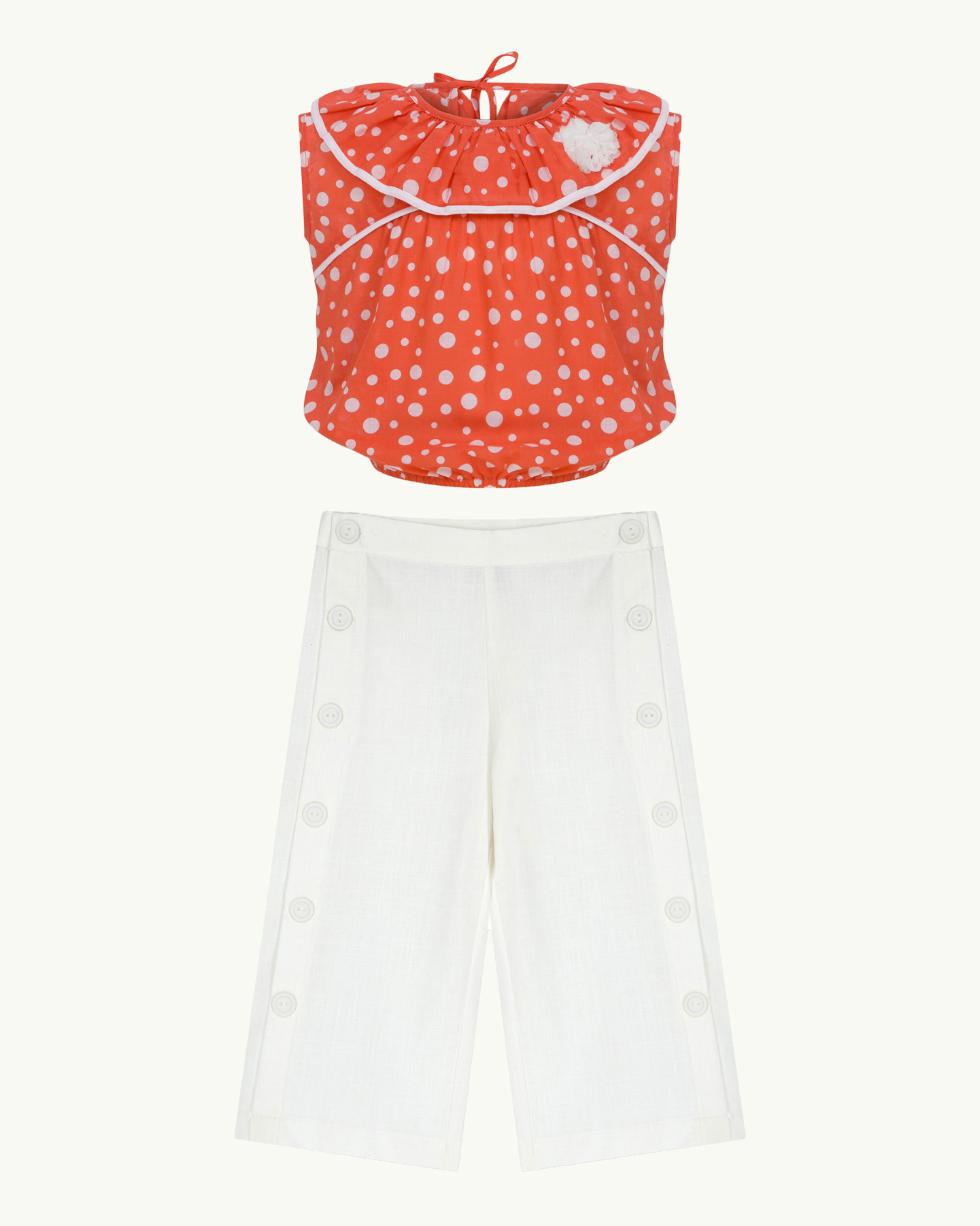 Kız Çocuk Puantiyeli Turuncu Bluz ve Ekru Bol Paça Pantolon Takımı