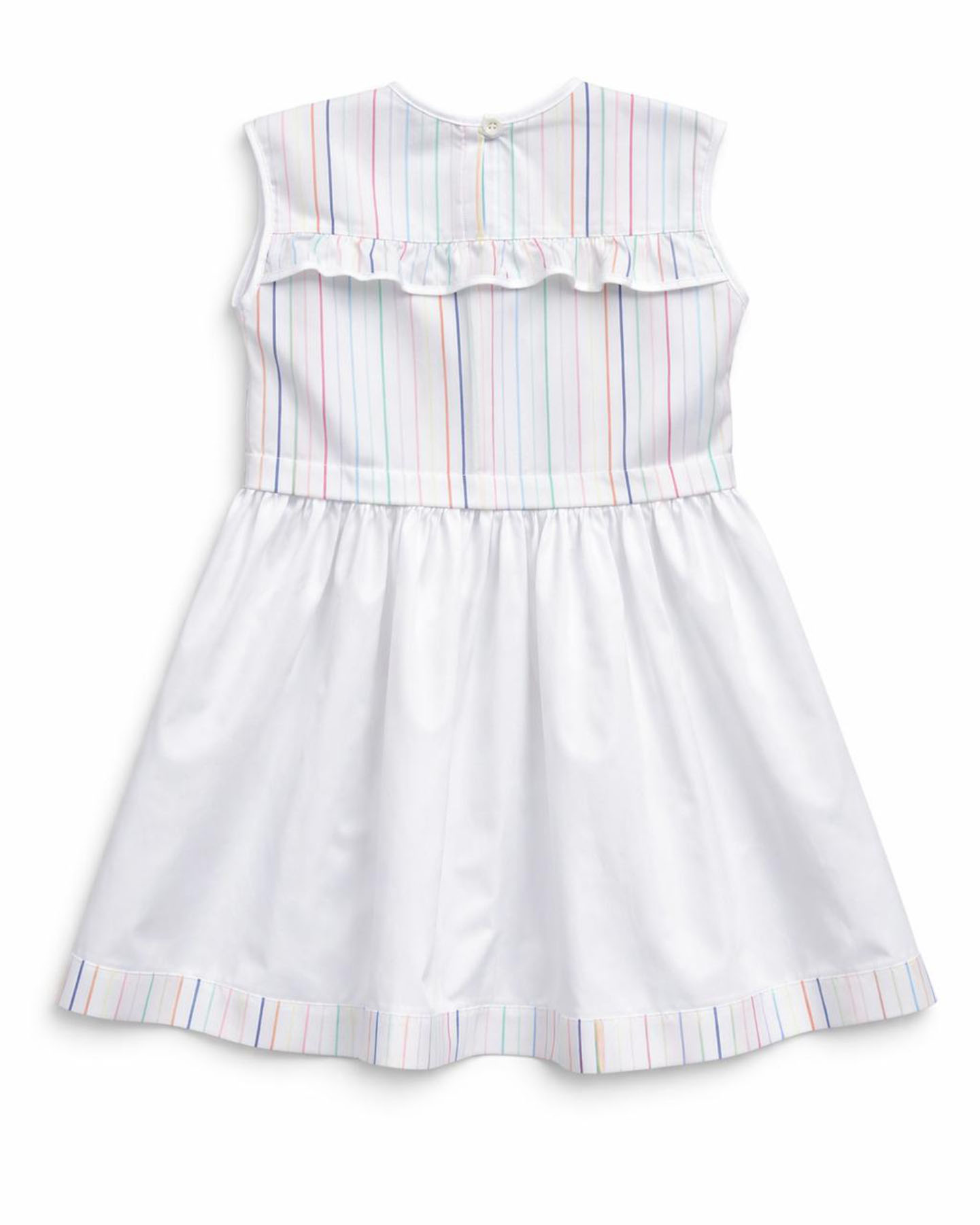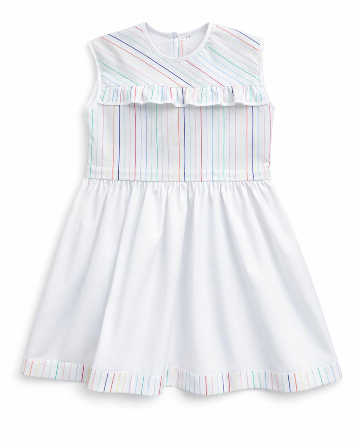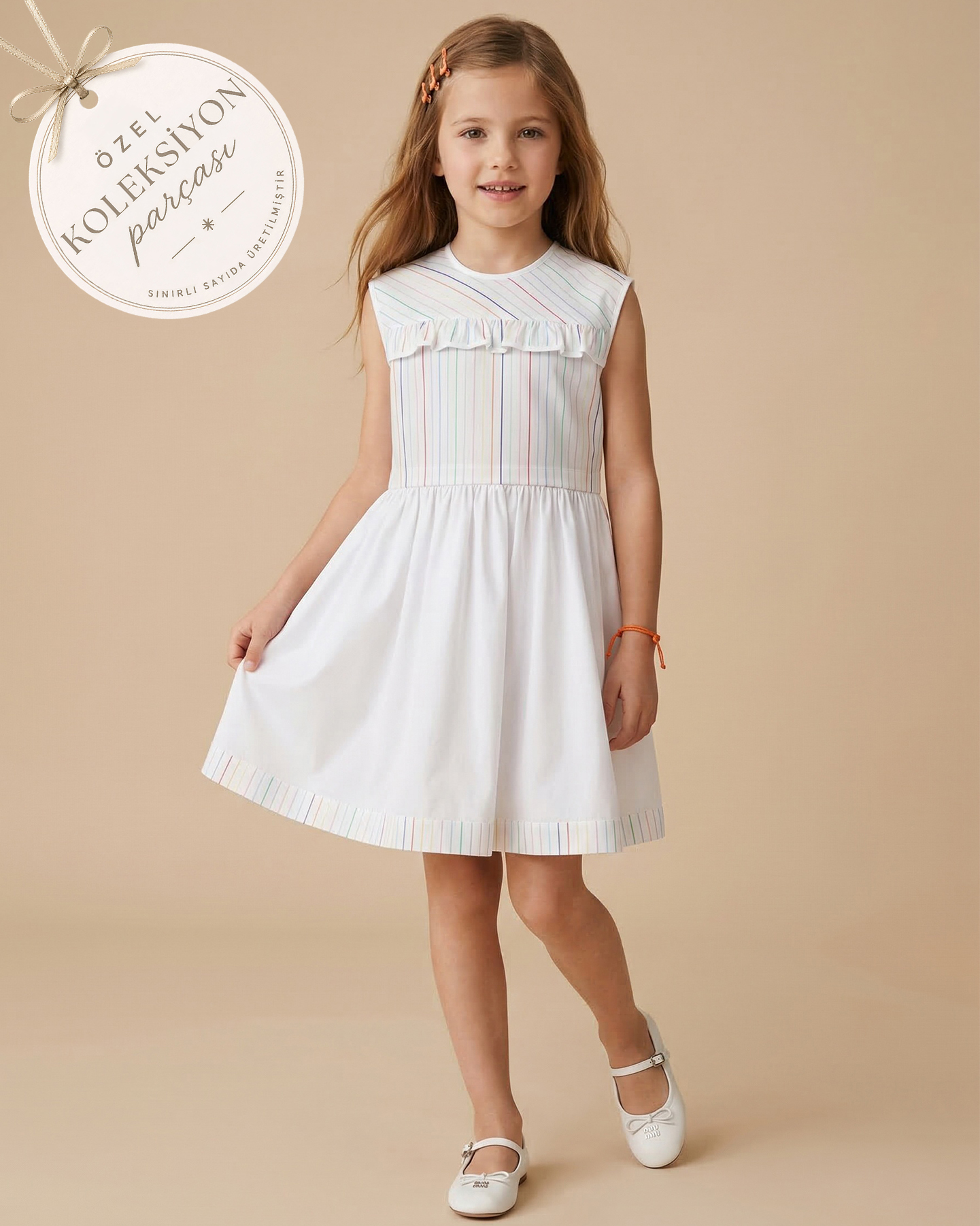 Canlı renkli çizgi desenleri ve zarif fırfır detayıyla dikkat çeken bu kız çocuk elbise, hafif ve rahat yapısıyla gün boyu konfor sağlar. Günlük kullanım ve özel günler için şık bir tercih sunar.