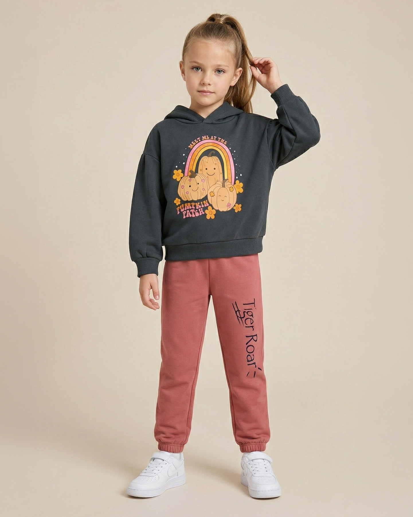 Rahat ve trend tasarımıyla öne çıkan kız çocuk eşofman takımı; baskılı kapüşonlu sweatshirt ve lastikli eşofman altından oluşur. Yumuşak dokulu kumaşı sayesinde gün boyu konfor sunarken, modern kesimi hareket özgürlüğü sağlar. Günlük kullanım, okul ve hafta sonu kombinleri için ideal olan bu takım, şıklık ve rahatlığı bir arada sunar