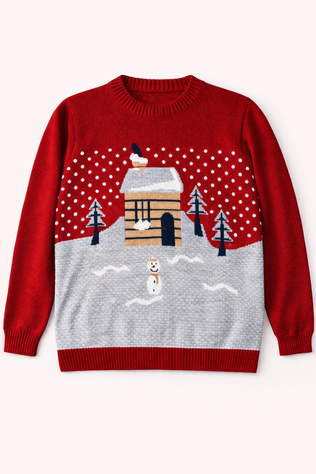 Erkek ve kız çocukların giyebileceği kış ve yılbaşı temalı koyu kırmızı renk kazak sıkı ilmikli triko kumaştan üretilmiştir.